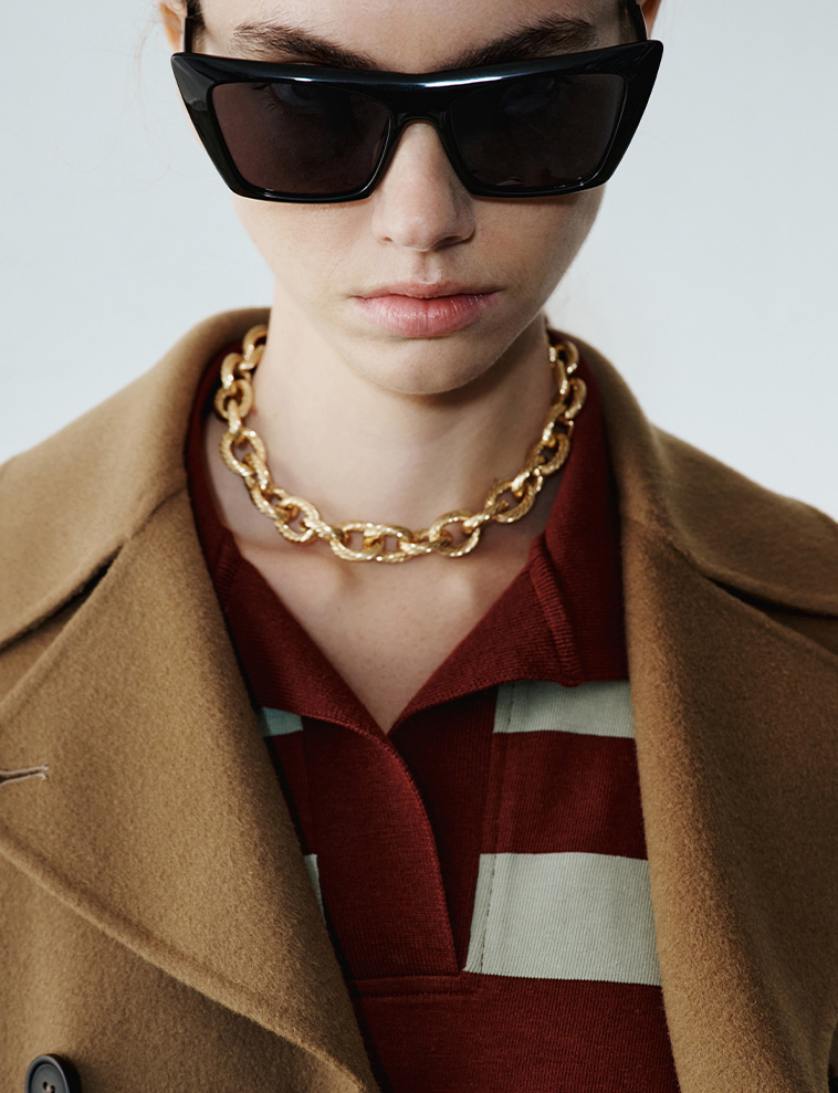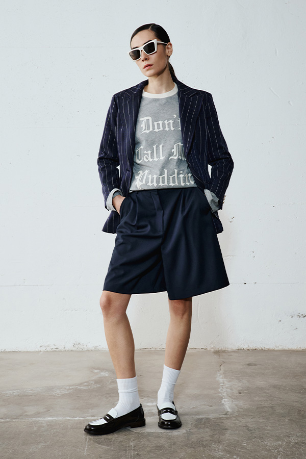 Desde las rayas burdeos de inspiración universitaria a la fluidez de las faldas plisadas, todos los conjuntos están pensados para moverse contigo, celebrando una elegancia natural a base de contrastes armoniosos y accesorios dorados de carácter atrevido.