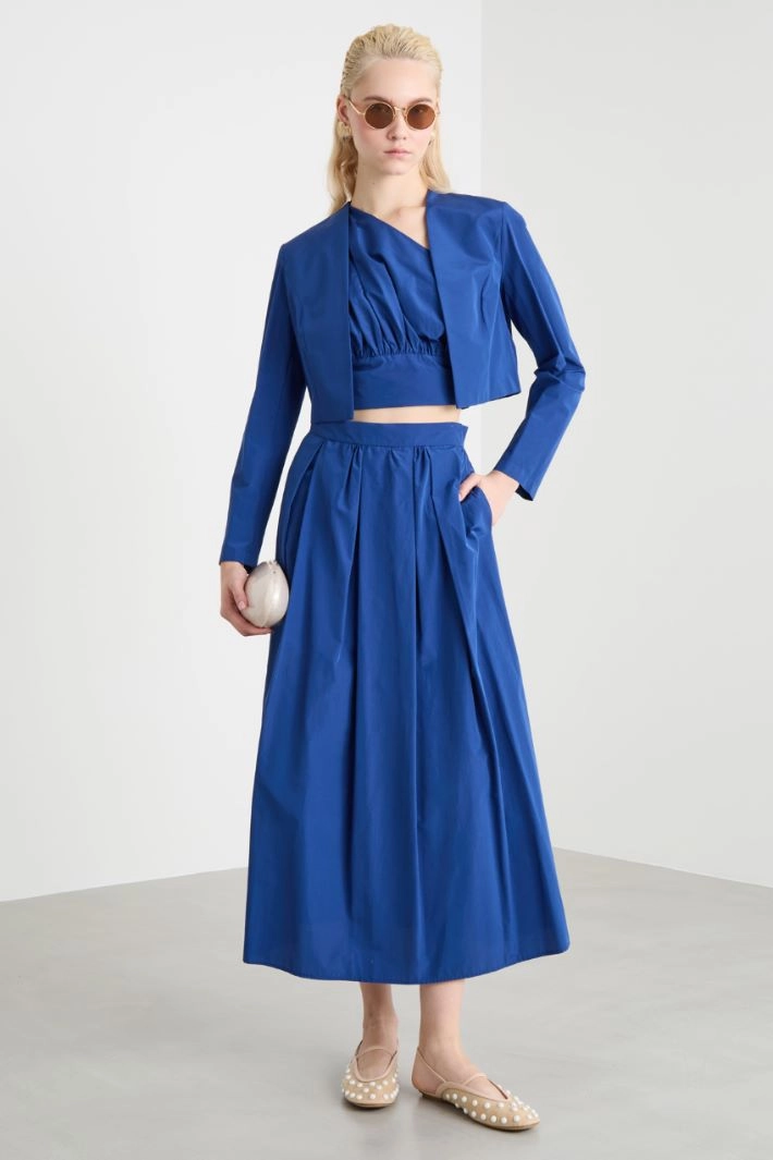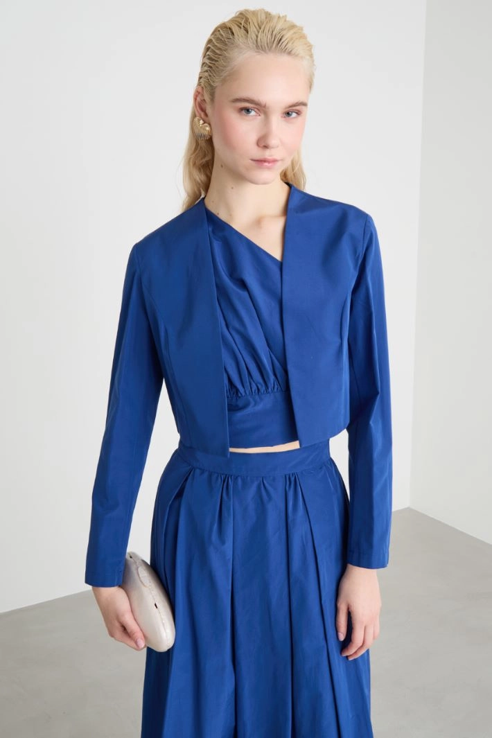 Bolero abierto de corte entallado realizado en tafetán de mezcla de algodón con mangas largas.
