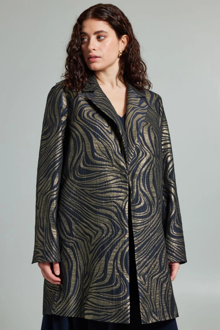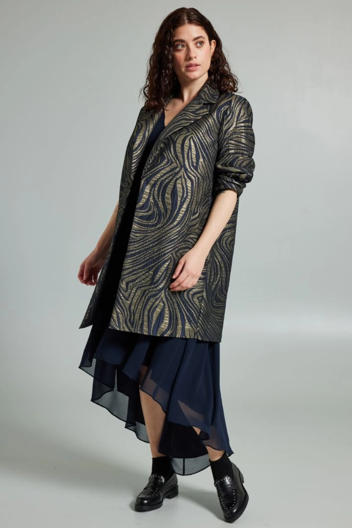 Sobretodo de corte recto realizado en tejido de jacquard, con aplicación de fibra de lamé, cuello de solapa, mangas largas con pequeña abertura y bolsillos laterales insertados en la costura. Cierre con gancho en la parte delantera. Sin forro.