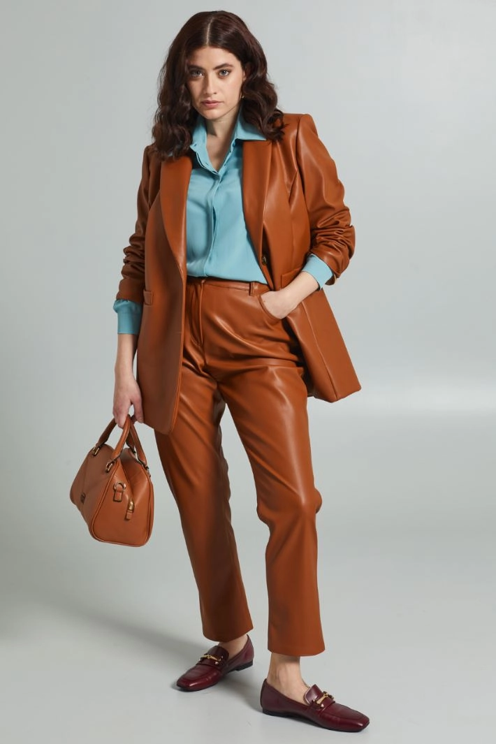 Pantalones de pitillo realizados en punto revestido efecto piel, con cinturilla, trabillas en la cintura y cinco bolsillos. Cierre con cremallera oculta y botón.