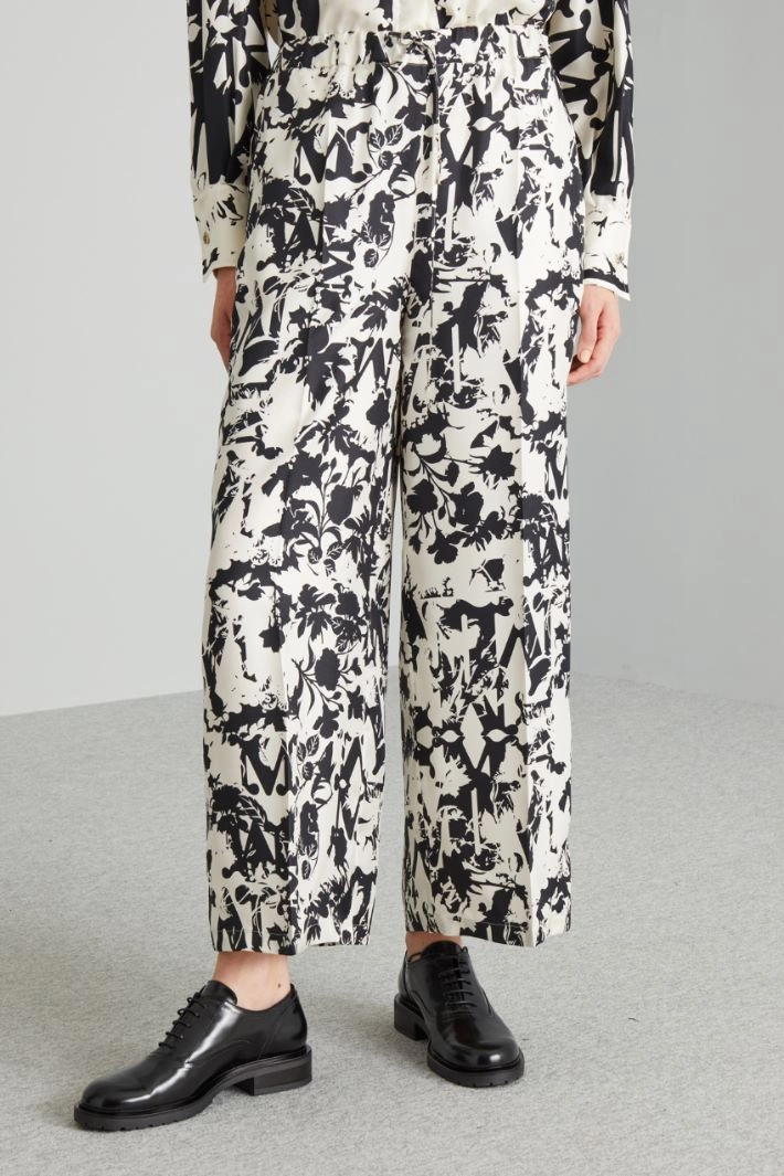 Pantalones de corte amplio y fluido realizados en sarga de seda pura estampada, con goma y cordón ajustable en la cintura, bolsillos franceses y bordes acabados con ribete.