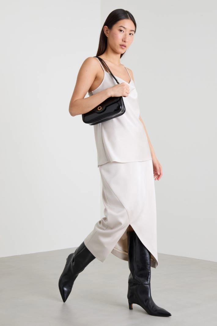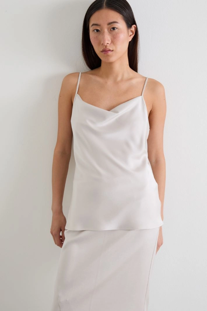 Top lencero realizado en enver satén con acabado brillante, escote en pico y tirantes finos.