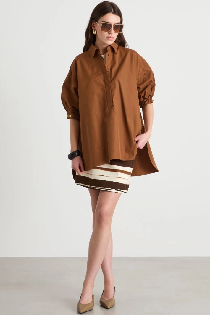 Camisa de corte amplio realizada en popelina de puro algodón, con cuello de punta, canesú en la espalda, mangas tres cuartos, puños elásticos con ojales metálicos y cordoncillo insertado en los laterales. Bajo asimétrico ligeramente más largo por detrás con aberturas laterales. Cierre con botones ocultos.