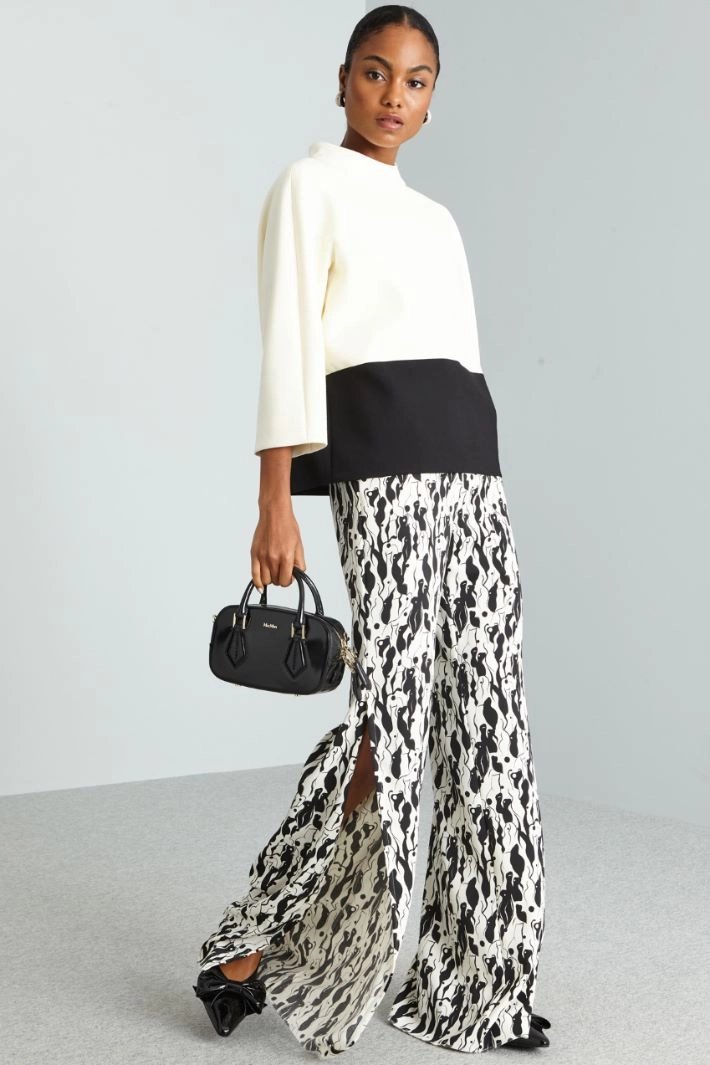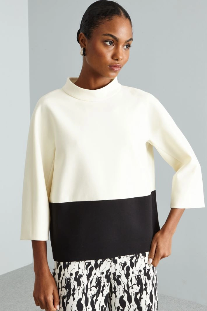 Blusón de corte recto realizado en tela doble de lana, con cuello alto redondo y mangas de tres cuartos. Cierre con cremallera en la parte trasera. Forrado.