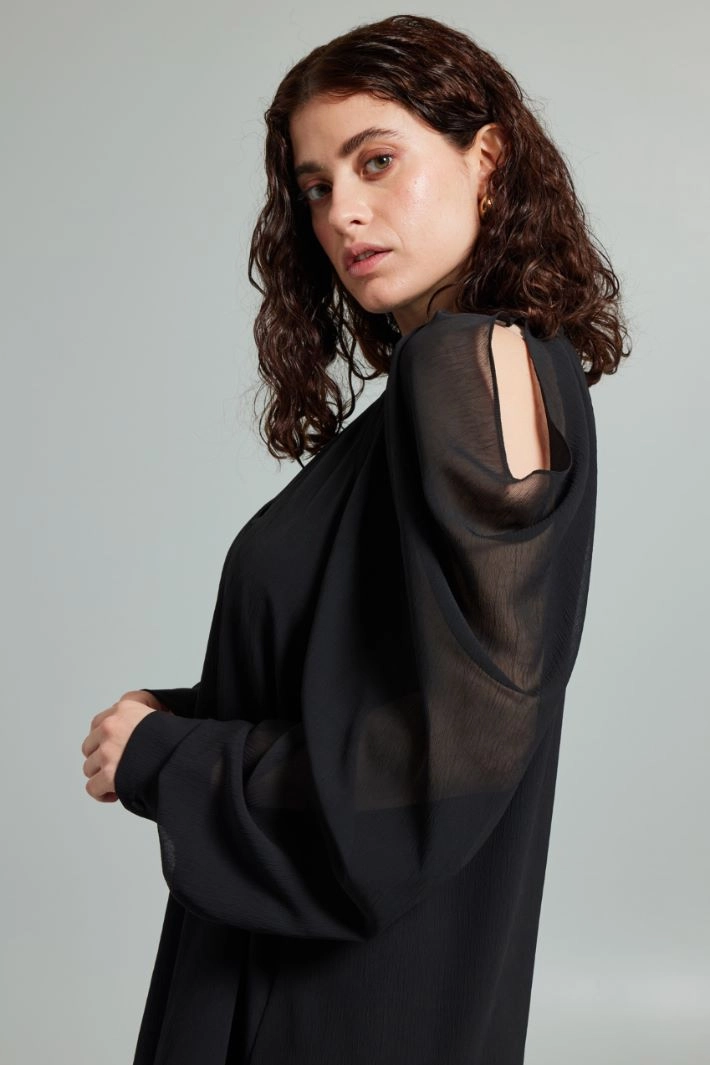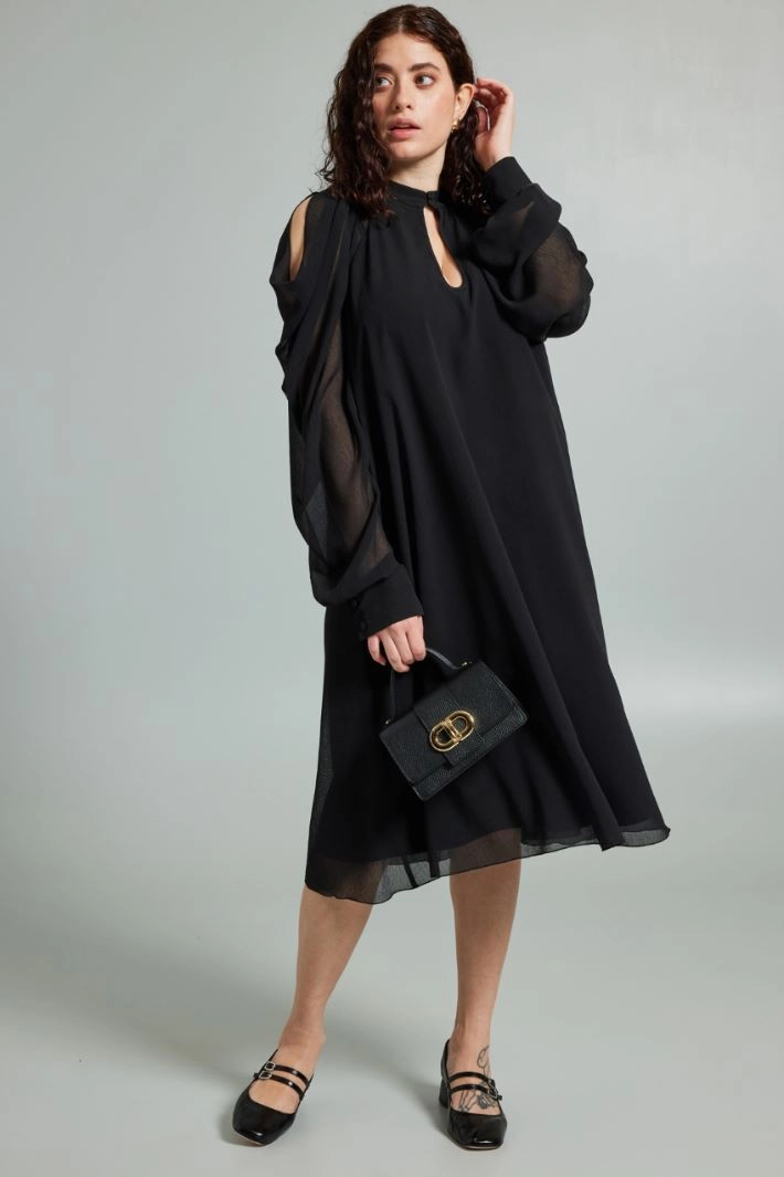 Vestido de corte fluido realizado en crespón, con cuello coreano, y mangas raglán largas con abertura en los hombros y diseño drapeado. Abertura de gota en la parte delantera. Cierre con botones. Prenda parcialmente forrada.