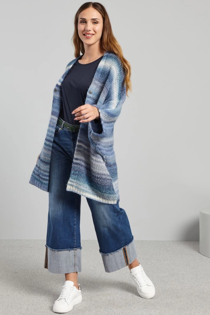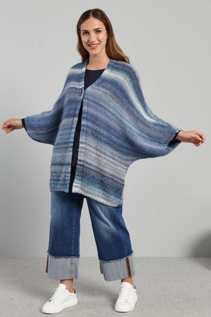 Cárdigan de corte suave realizado en hilado de mezcla de lana de hilo teñido, con escote en V y mangas kimono de tres cuartos. Cierre con botón a presión.