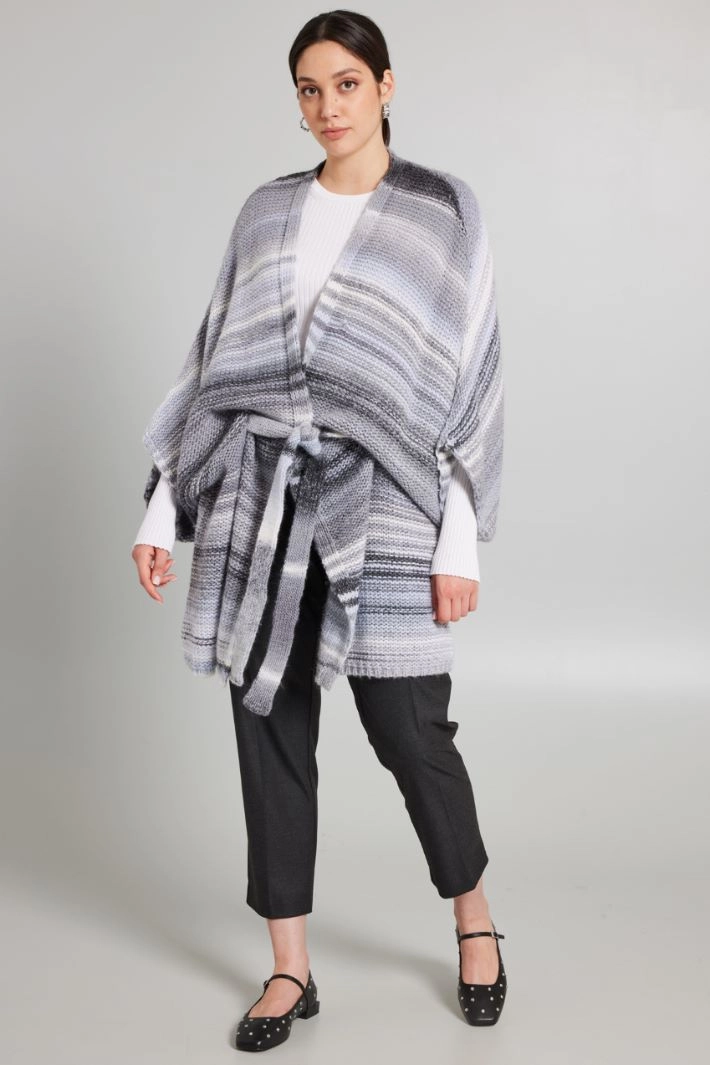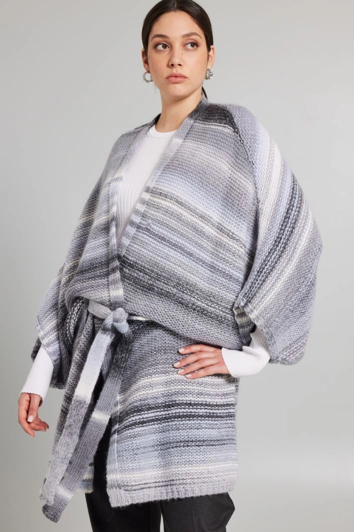 Cárdigan de corte suave realizado en hilado de mezcla de lana de hilo teñido, con escote en V y mangas kimono de tres cuartos. Cierre con botón a presión.