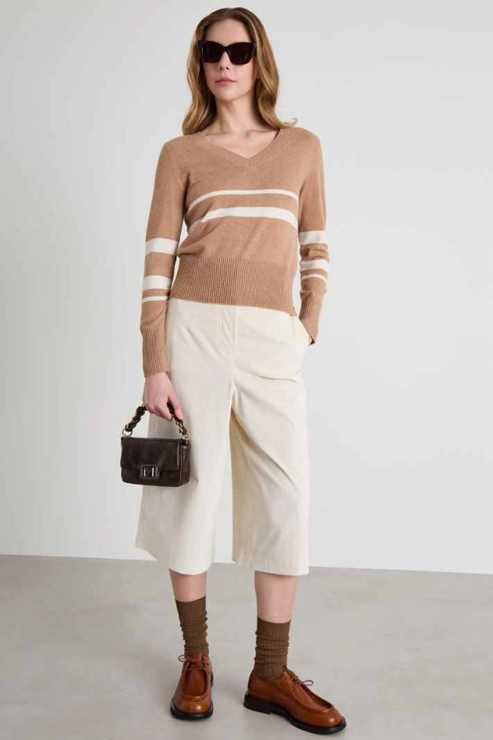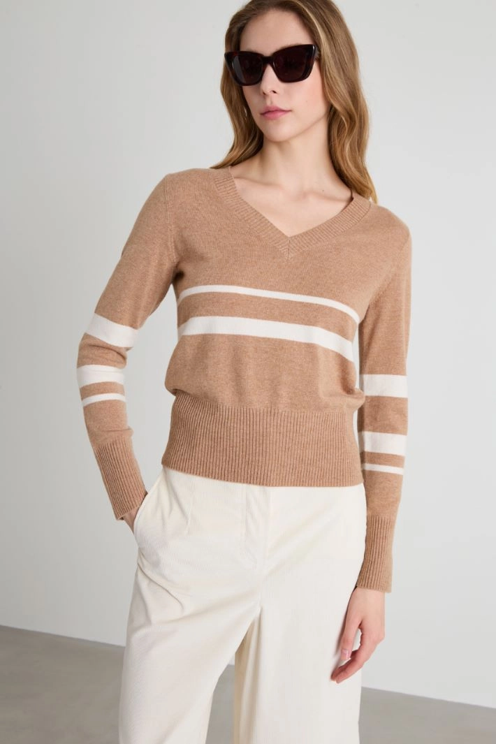 Suéter de corte regular realizado en mezcla de lana y viscosa, con motivo de intarsia, cuello de pico, manga larga con botones en los puños y acabados en canalé.