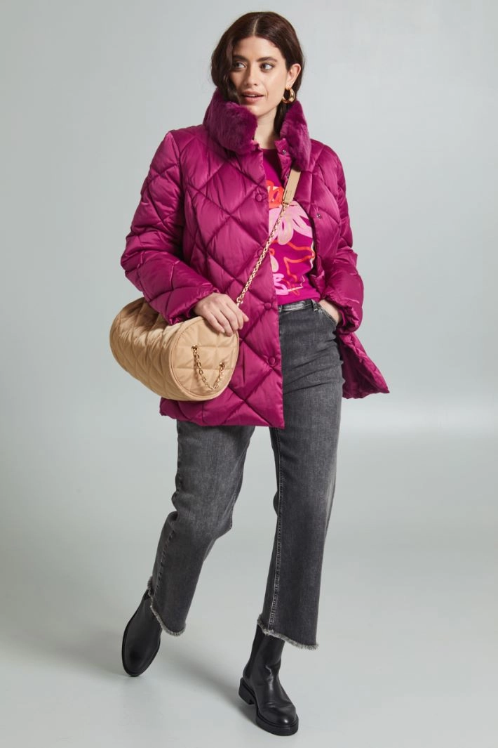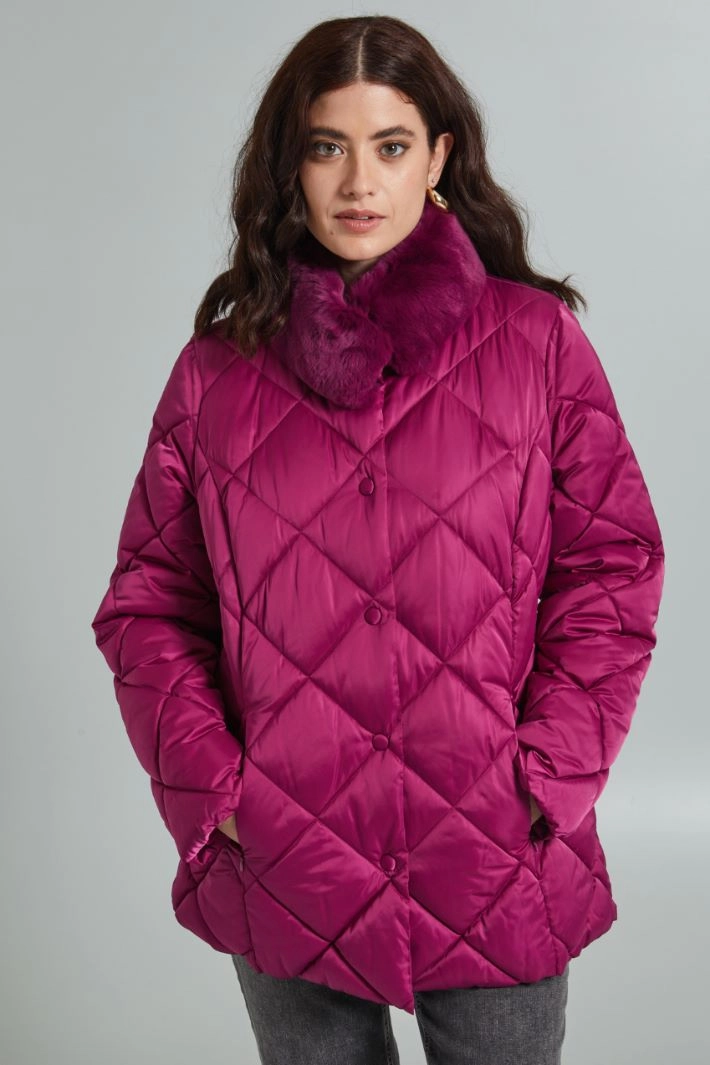 Anorak de corte clásico realizado en satén técnico acolchado, con cuello con borde de pelo extraíble, mangas largas y bolsillos laterales insertados en la costura con cremallera invisible. Cierre simple con botones a presión a juego.