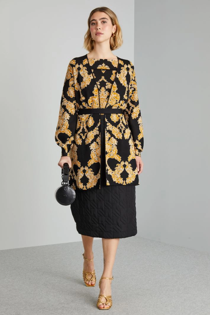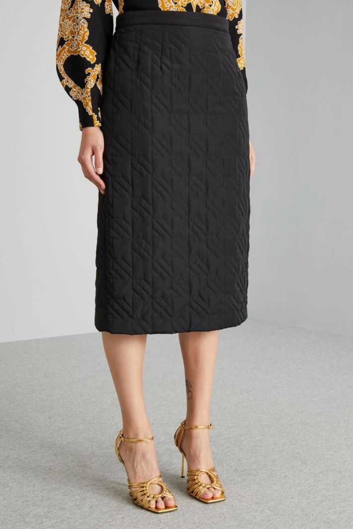 Falda de tubo realizada en tela técnica ligeramente acolchada, con abertura central. Cierre con cremallera invisible y botón en la parte trasera. Prenda forrada.