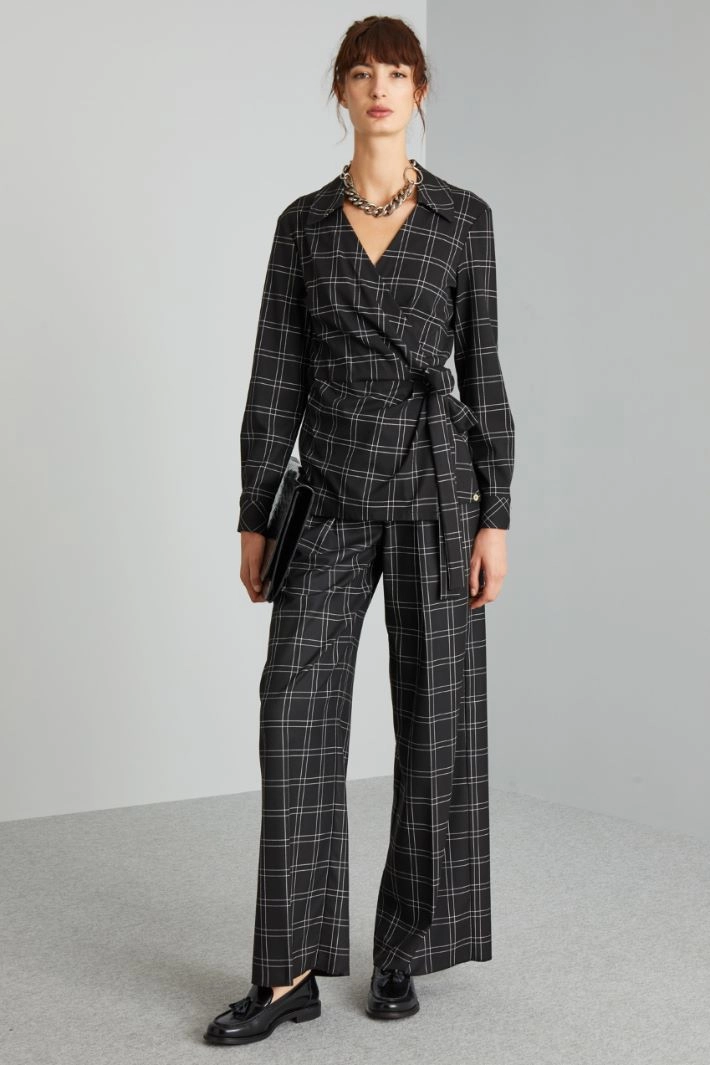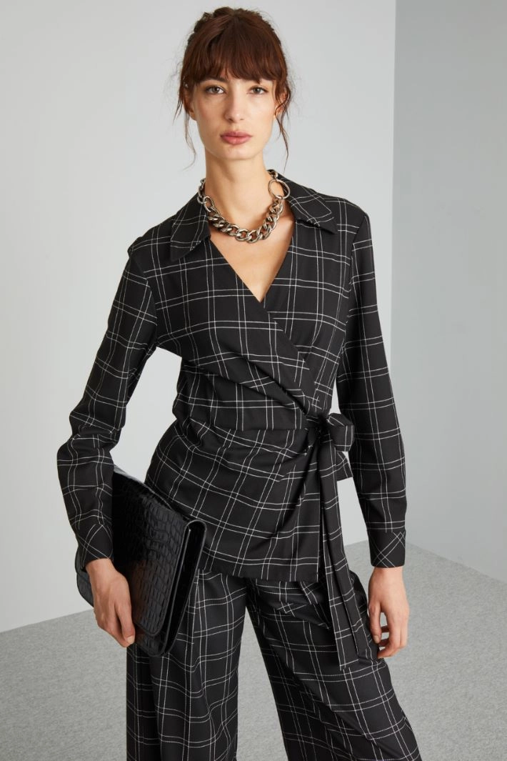 Blusón de corte recto realizado en batavia de mezcla de viscosa elástica de hilo teñido, con cuello de camisa, escote en V, y mangas largas con puño y botón. Cierre cruzado con fajín en la cintura.
