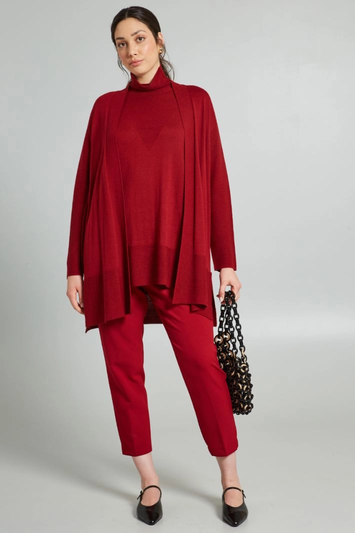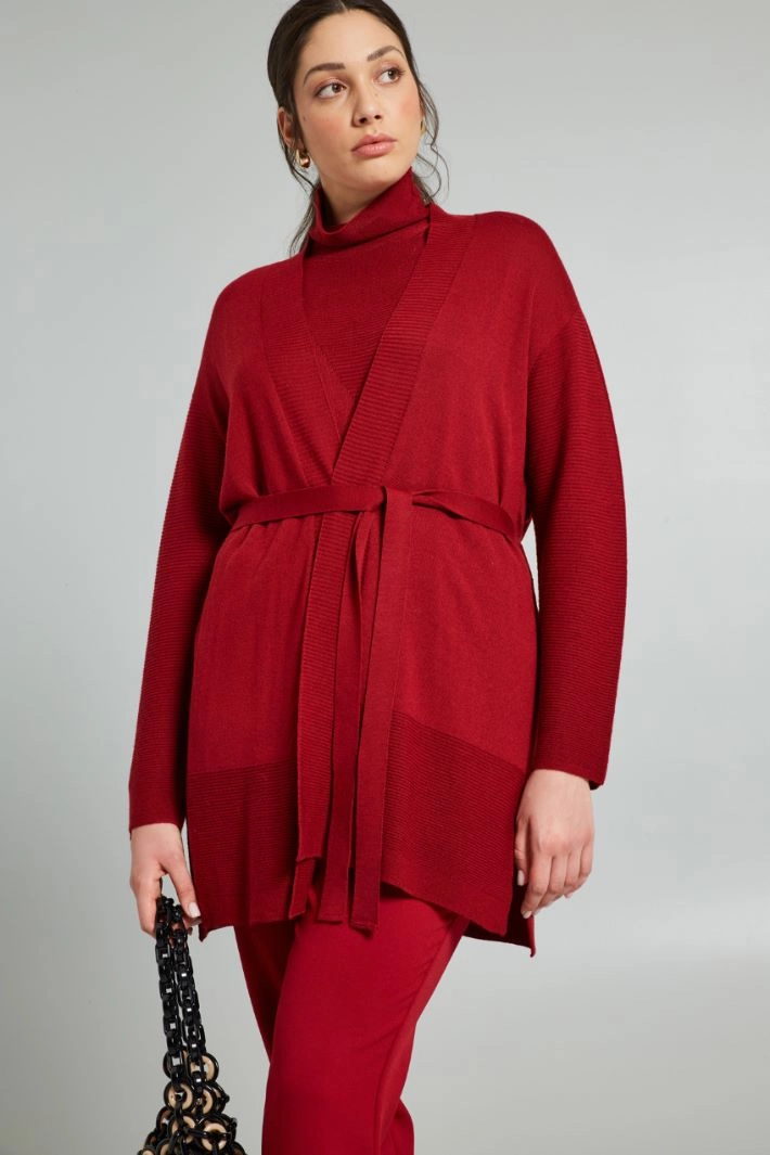 Cárdigan de corte suave realizado en hilado de mezcla de lana, con detalles en relieve, escote en V, mangas largas y bajo con aberturas laterales. Cierre con cinturón a juego.