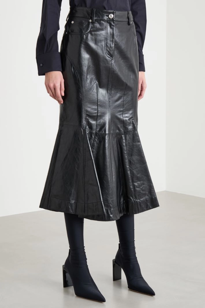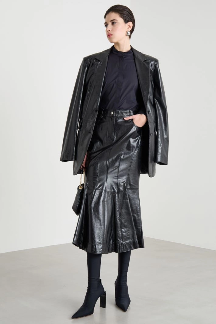 Falda de corte sirena realizada en piel con acabado brillante, con bolsillos redondeados en la parte delantera, cortes y pinzas, bolsillos de parche traseros y aberturas laterales solapadas. Forrada. Cierre con botón y cremallera.