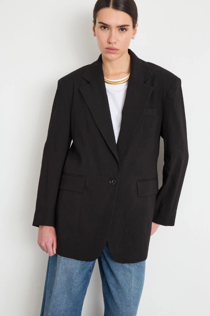 Blazer oversize de corte recto realizado en tejido de lino y viscosa, con cuello solapa decorado con un broche en forma de flor, bolsillo de parche en el pecho, mangas largas y bolsillos delanteros con solapa. Forrado. Cierre con botón.