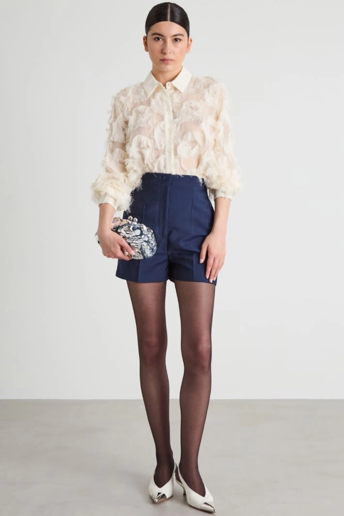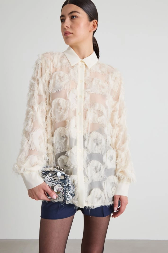 Blusa de corte recto realizada en georgette y fil coupé, con cuello clásico y manga larga con puños. Cierre con botones.
