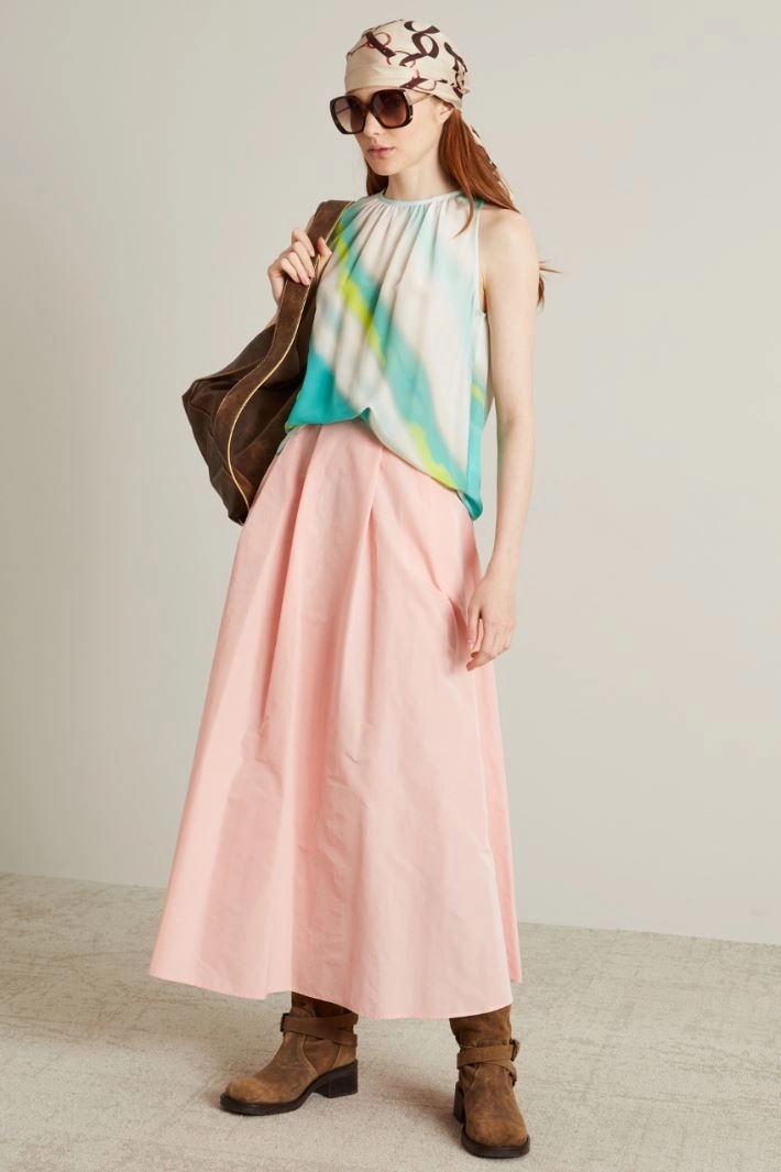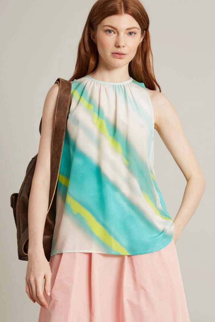 Top de línea fluida realizado en crepé de China de pura seda estampado, con escote redondo fruncido, sin mangas y cierre de cerradura con botón en la espalda.