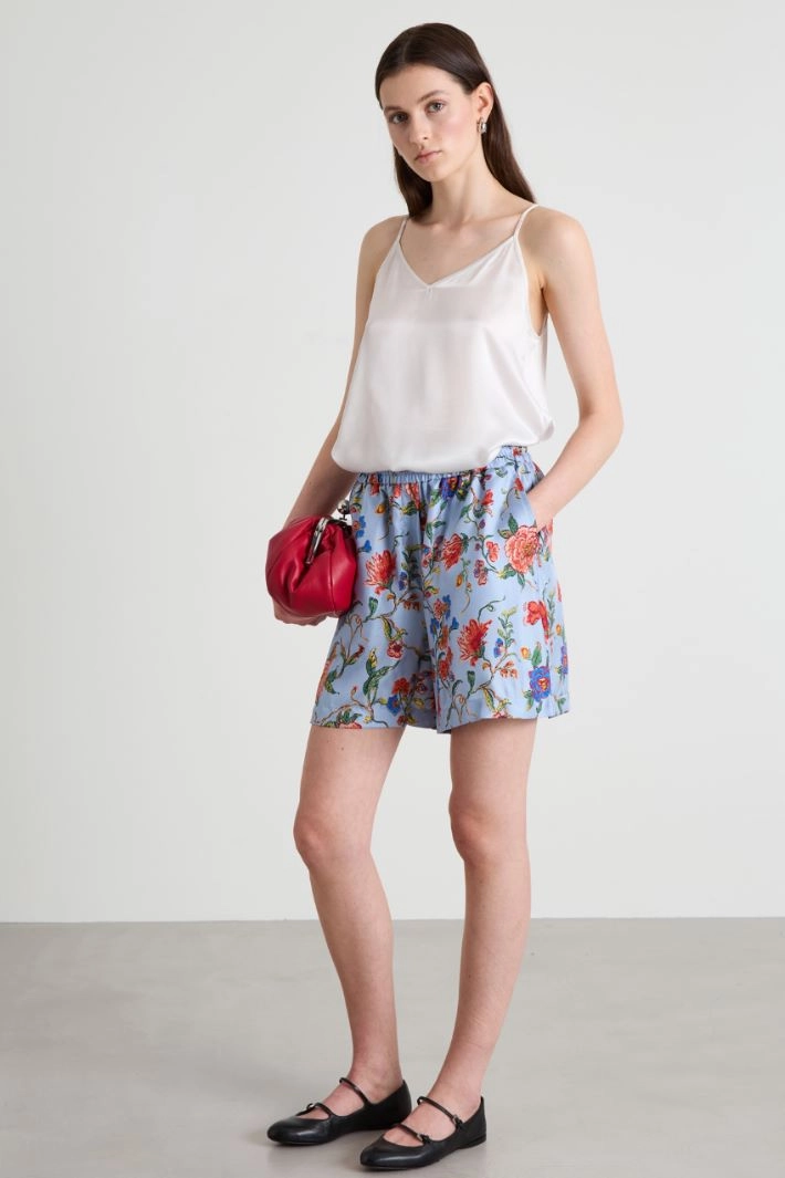 Top lencero fluido realizado en satén mezcla de seda, con escote en pico y tirantes finos ajustables.