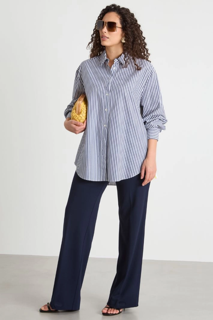 Blusón de corte evasé realizado en algodón estampado, con cuello camisero y mangas largas con puños y botones, corte canesú en la espalda y bajo redondeado y asimétrico, con detalle de grogrén en los laterales. Cierre con botones.