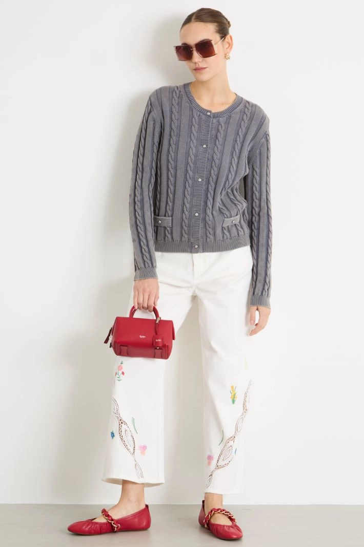 Cárdigan de corte entallado realizado en puro algodón de punto trenzado y canalé, con cuello redondo, manga larga y bolsillos de ribete simulados en el bajo. Acabados en canalé. Cierre con botones.