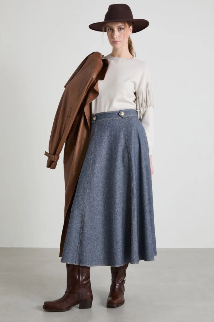Jersey de corte recto realizado en hilo mezcla de viscosa, con cuello redondo, manga larga caída con motivo de flecos y acabado en canalé.