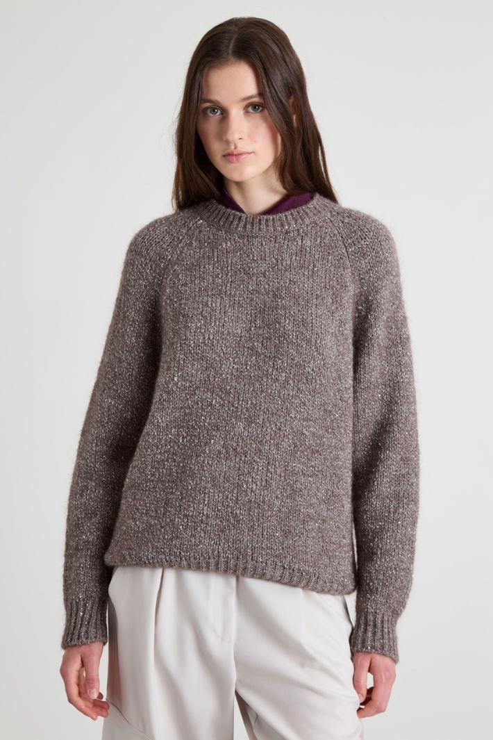 Jersey de corte recto realizado en hilo de lentejuelas, cuello redondo y manga larga raglán.