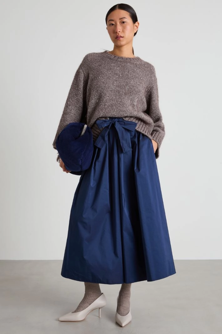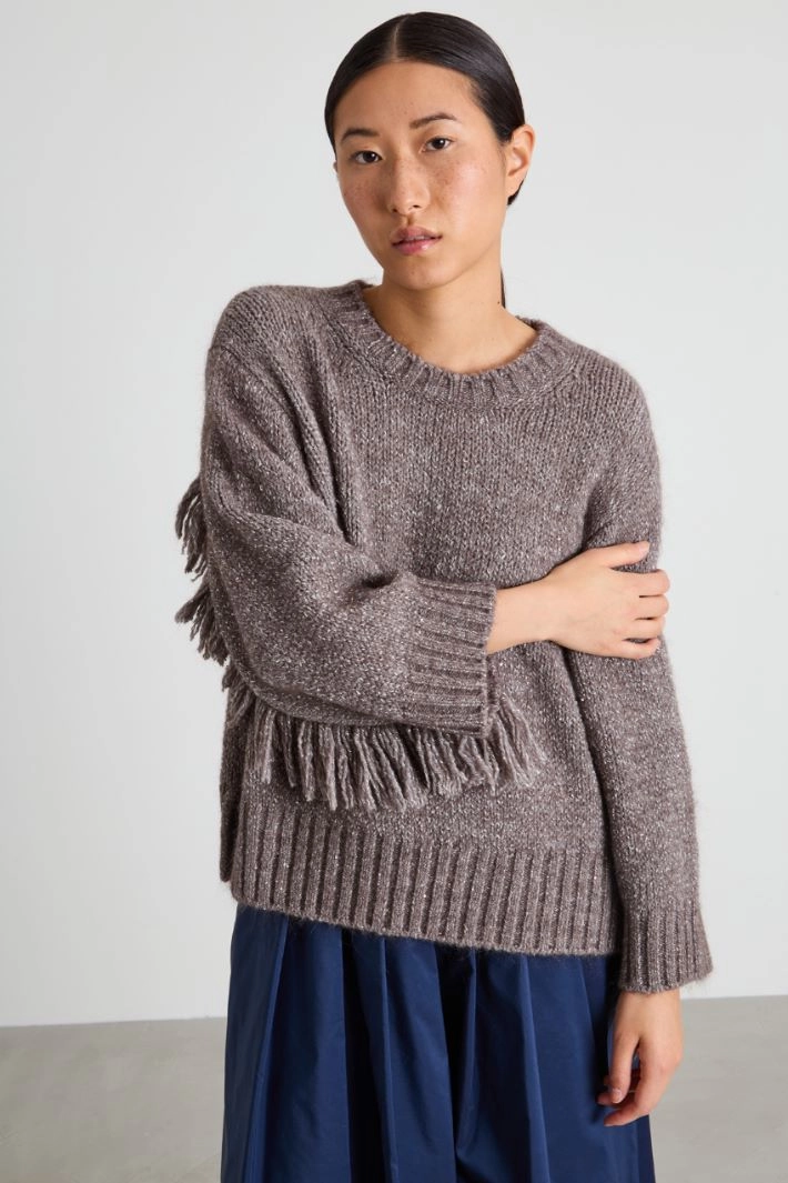Jersey de corte recto realizado en hilo mezcla de mohair, con motivo de microlentejuelas bordadas a juego, cuello redondo y mangas largas caídas con detalle de flecos. Aberturas laterales y bordes acanalados.