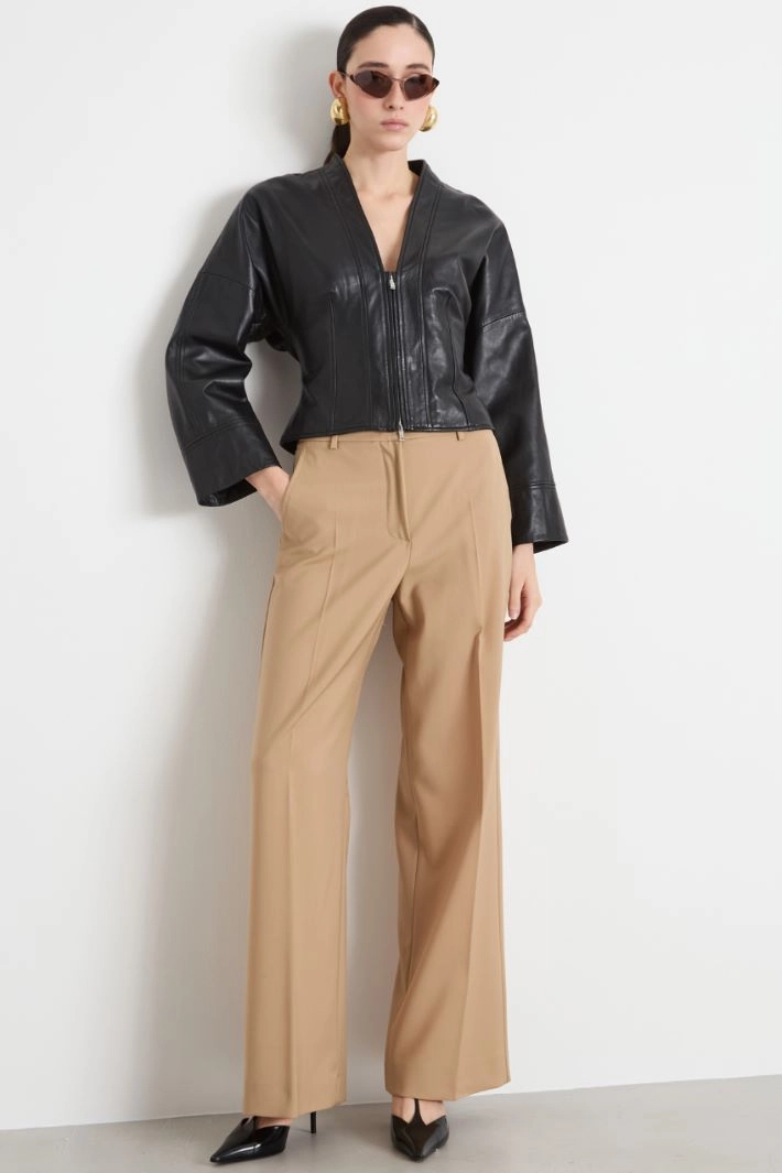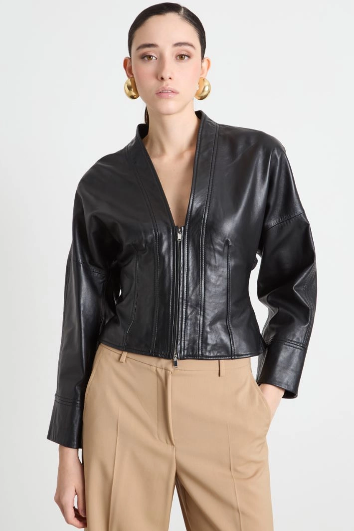 Cazadora de corte entallado realizada en napa brillante, con cuello chal, mangas largas y cortes que definen la silueta. Forrada. Cierre de cremallera.