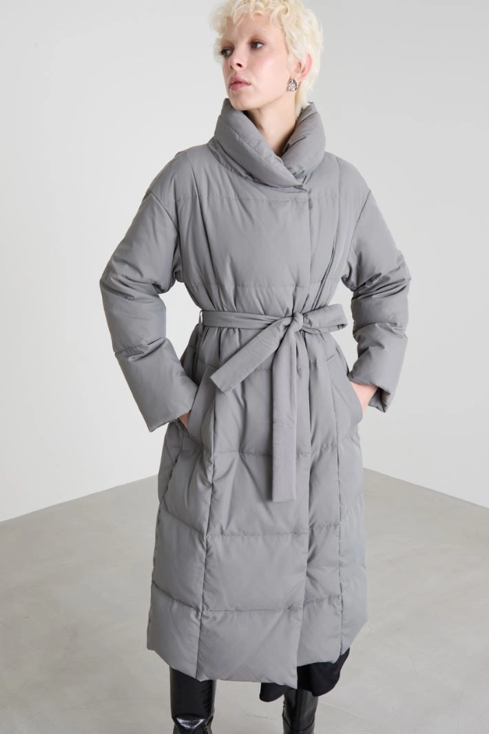Plumífero largo y recto de lona técnica acolchada, con cuello alto, manga larga, bolsillos laterales de ribete y cierre cruzado oculto con botones a presión. Cinturón a juego.