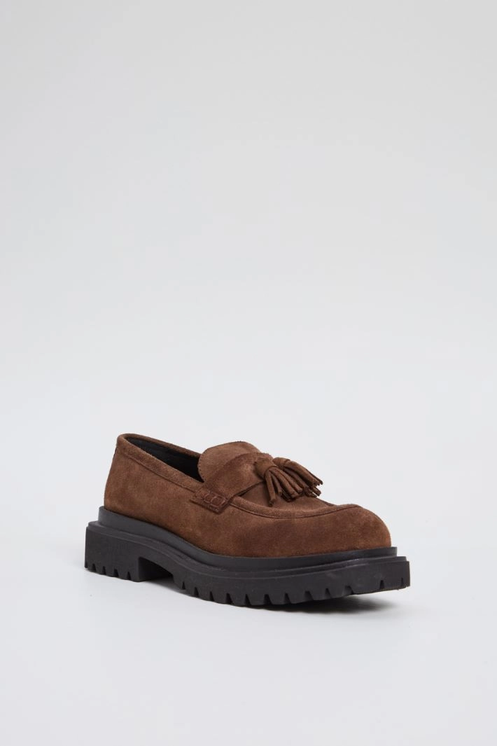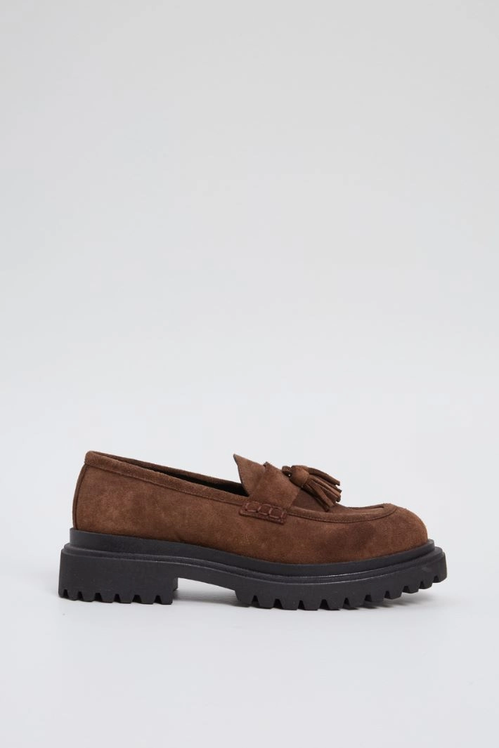 Mocasines realizados en auténtica piel efecto ante, con detalle de banda en la parte delantera rematada con borlas a juego. Forro de cuero, suela de trekking de goma.