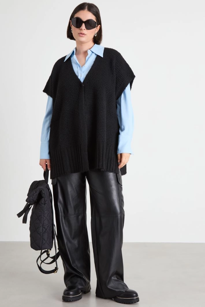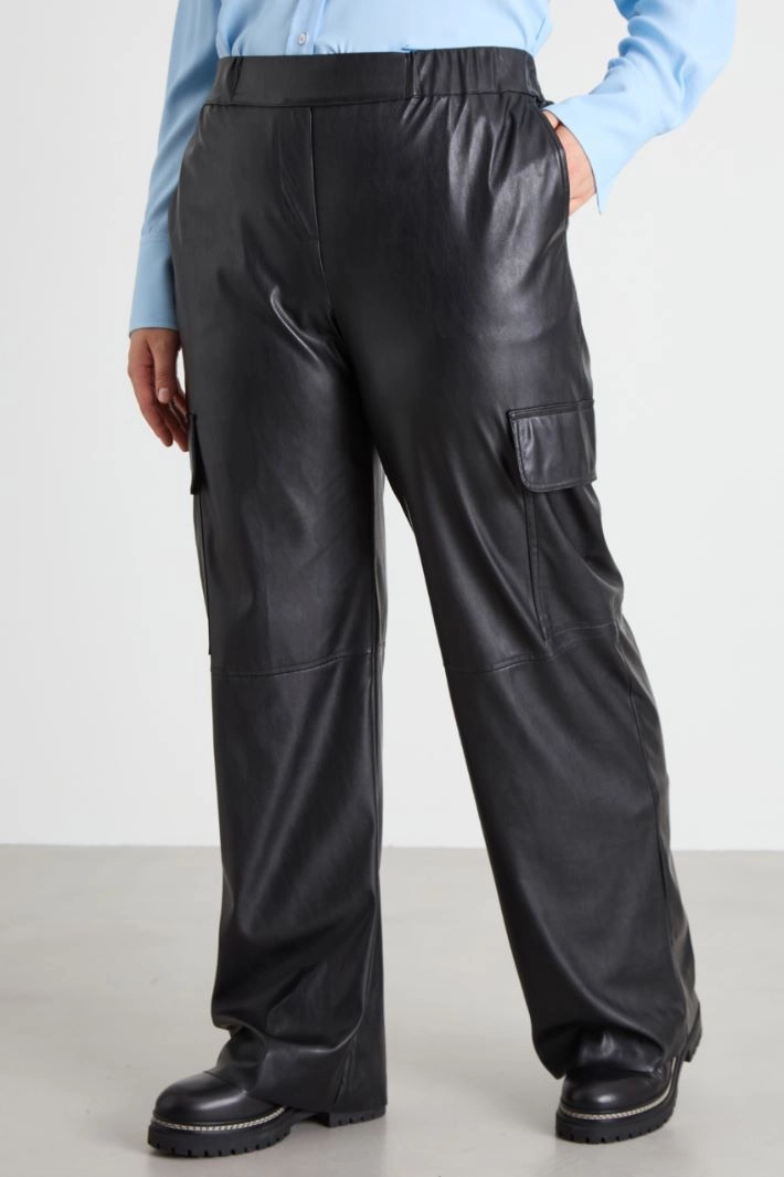 Pantalón recto realizado en punto de piel sintética, con cinturilla elástica, bolsillos franceses y bolsillos de parche con solapa a lo largo de la pierna.