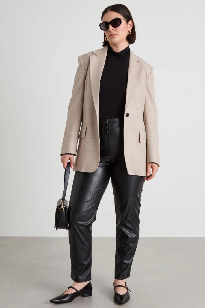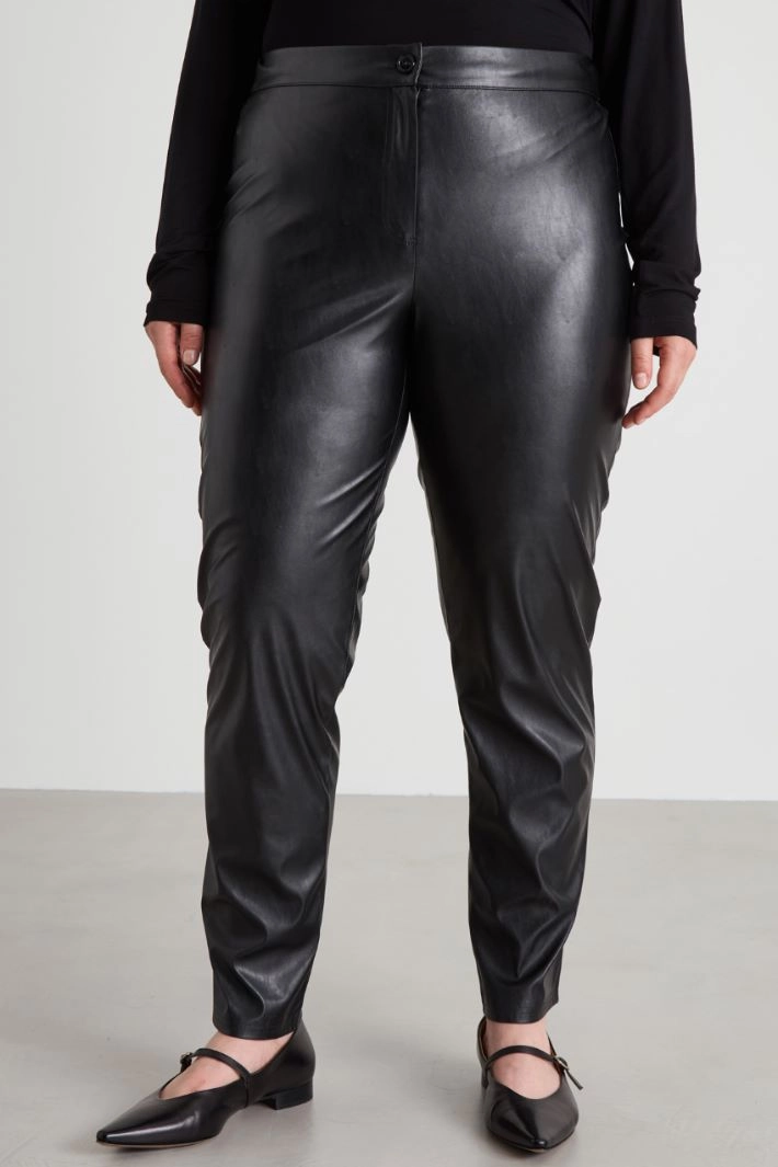 Pantalón ajustado realizado en piel sintética, con cinturilla elástica en la espalda y cierre de cremallera y botón.