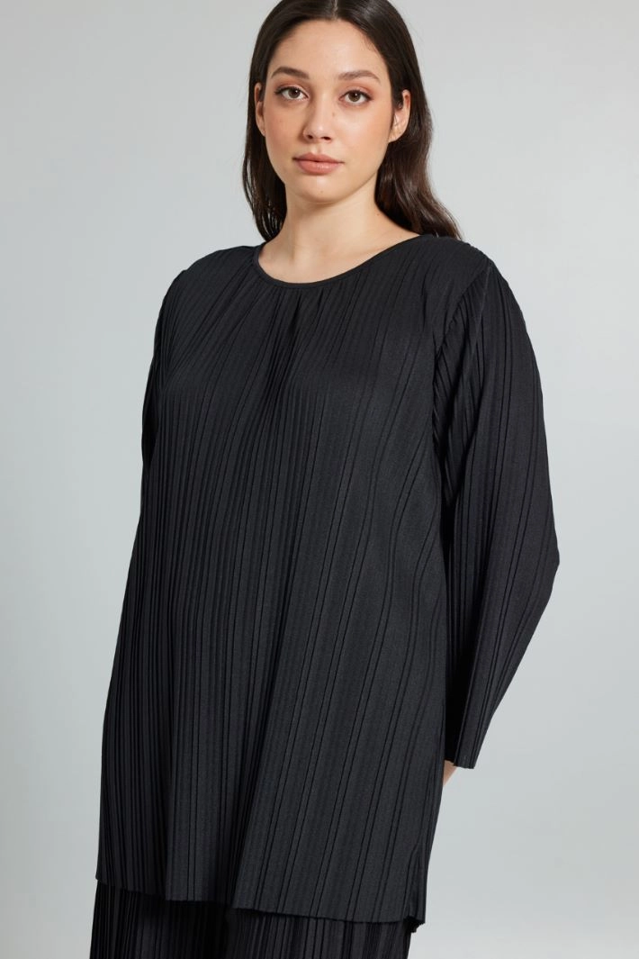 Blusa de corte recto realizada en punto plisado, con cuello redondo y mangas largas.