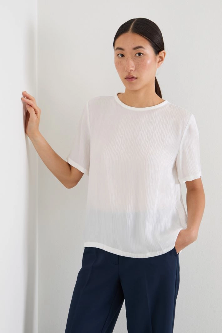 Camiseta de corte regular de jacquard de mezcla de seda, cuello redondo y manga corta. Cierre de lágrima en la espalda con botón.