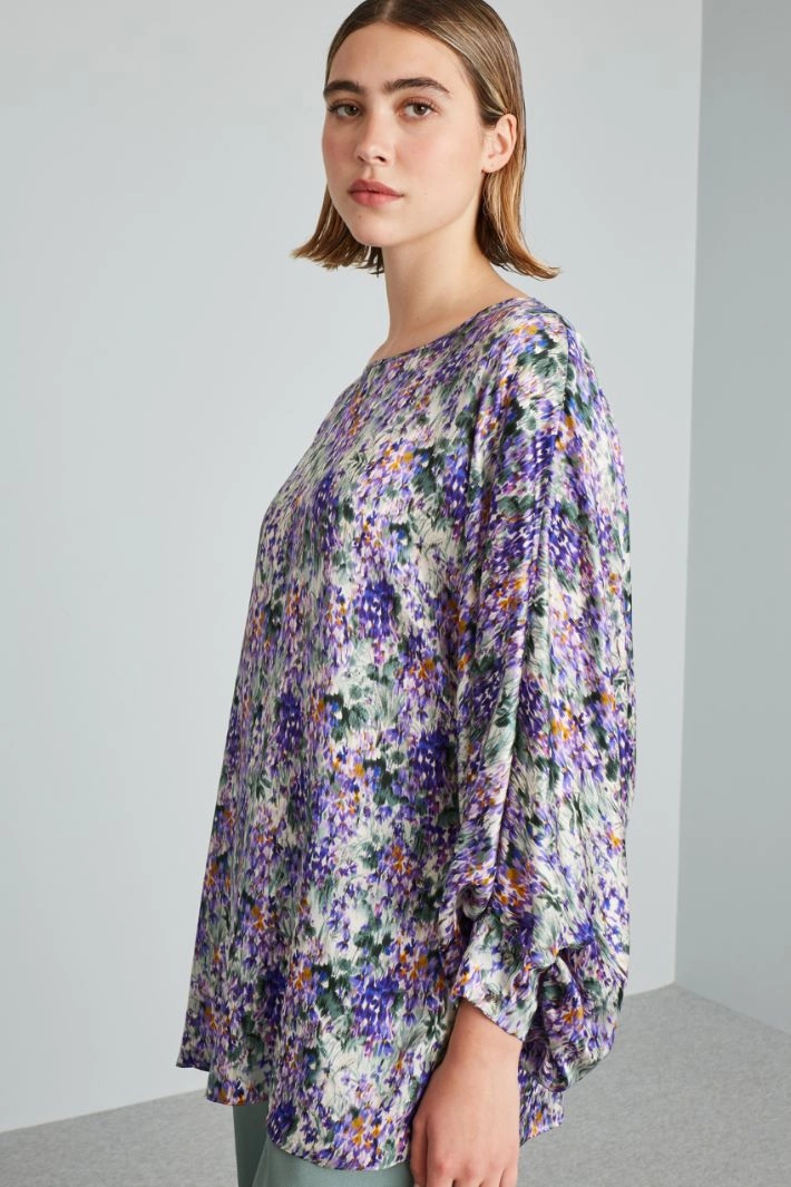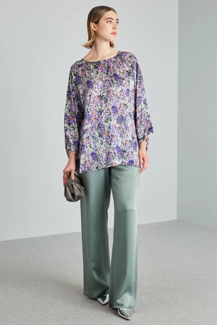 Blusa de corte fluido realizada en satén de seda pura estampada, con cuello barco, y mangas largas abullonadas con puño y botones joya.