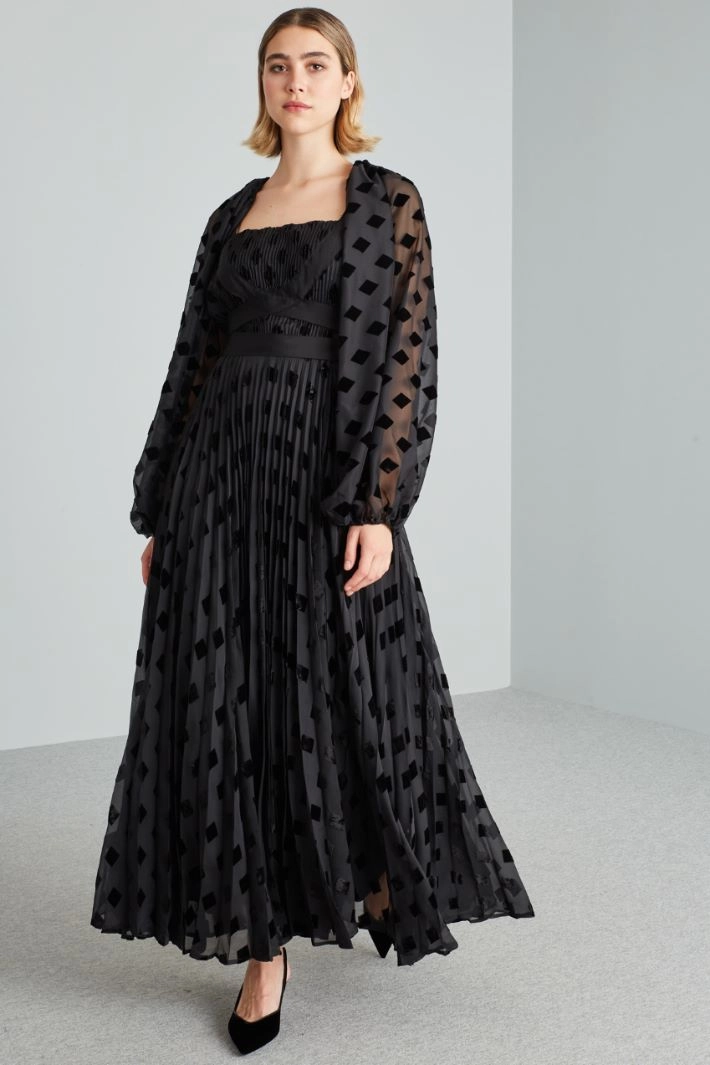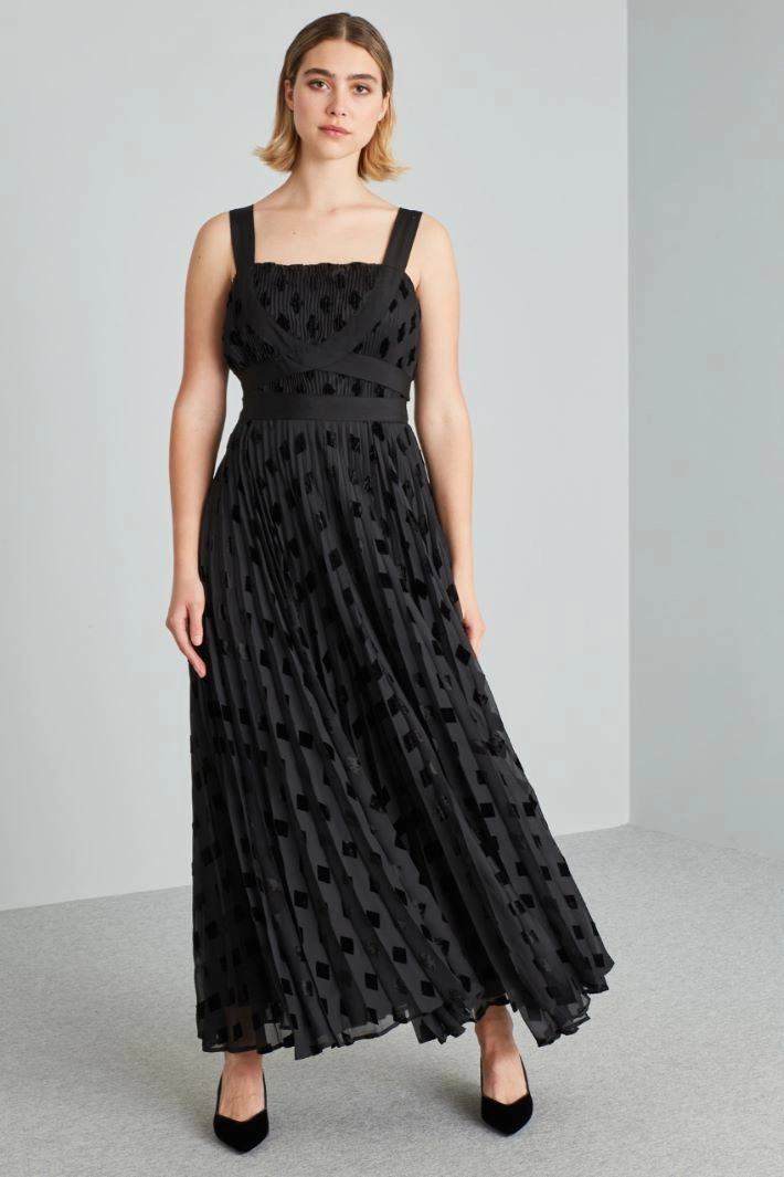 Vestido largo bustier confeccionado en georgette devoré con estampado de rombos de terciopelo plisado. Las tiras cruzadas de grogrén a tono que forman los tirantes se cruzan en la parte delantera y crean un cinturón para anudar en la cintura. El modelo tiene corte acampanado y cierre con cremallera oculta en el lateral. Un vestido inédito, perfecto para una ceremonia o un evento importante.La prenda forma parte de la colección Elegante.