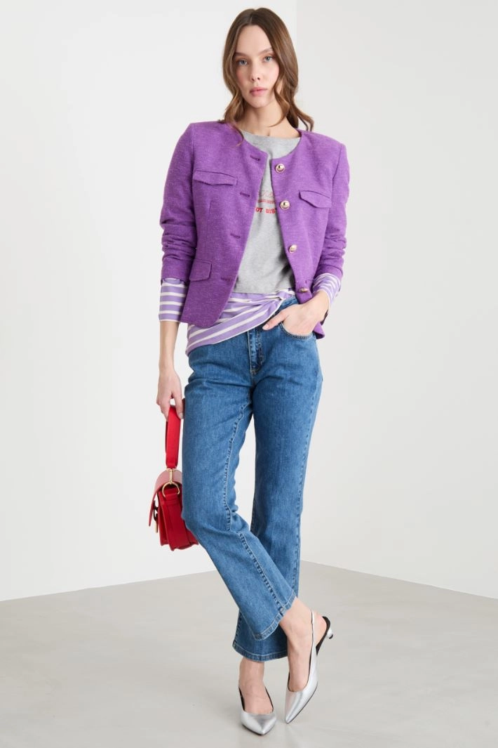 Chaqueta de corte entallado realizada en natté, con cuello redondo, mangas largas y bolsillos con solapa. Forrada. Cierre con botones joya.