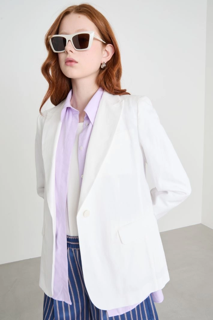 Blazer de corte entallado realizado en tejido de algodón y lino, con cuello solapa, mangas largas, bolsillo superior y bolsillos inferiores de ribete con solapa. Abertura central en la espalda. Semiforrado. Cierre con un solo botón.