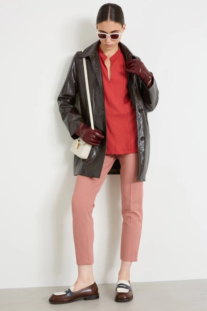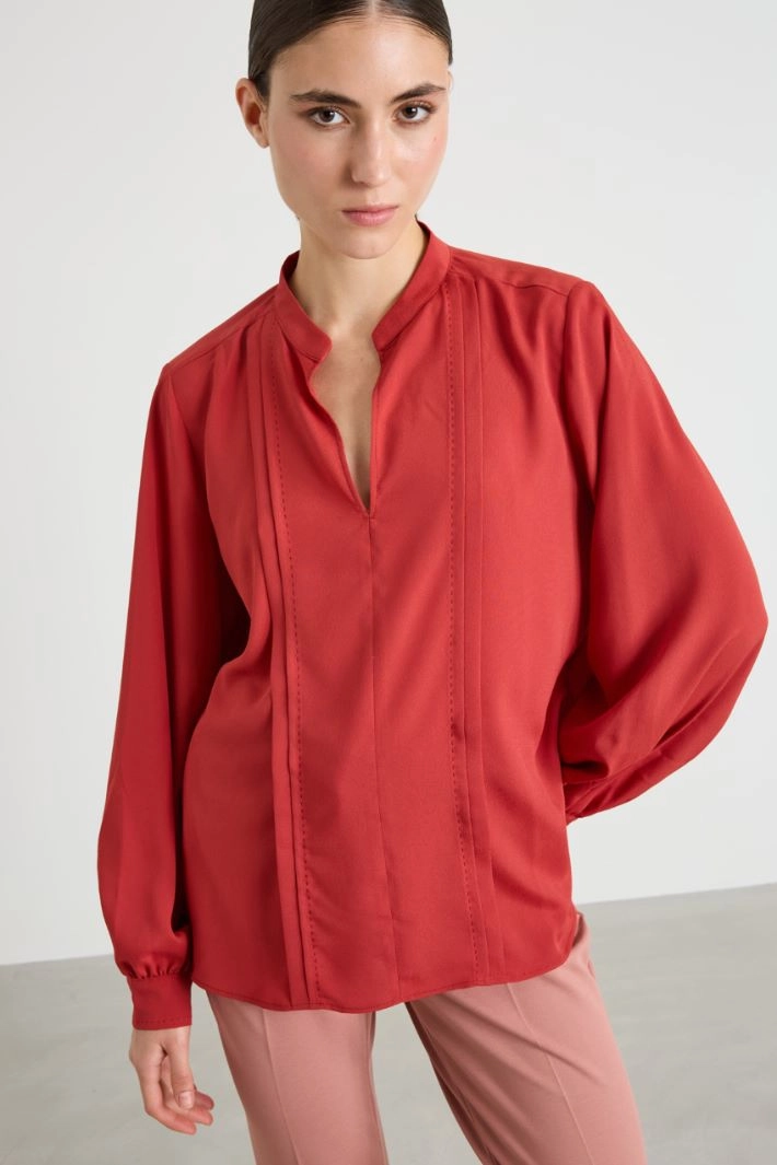 Blusa fluida realizada en crepe de China, con motivo plisado en la parte delantera, cuello mao rematado con abertura en forma de pico, mangas largas abullonadas con puños y botón y aberturas laterales.