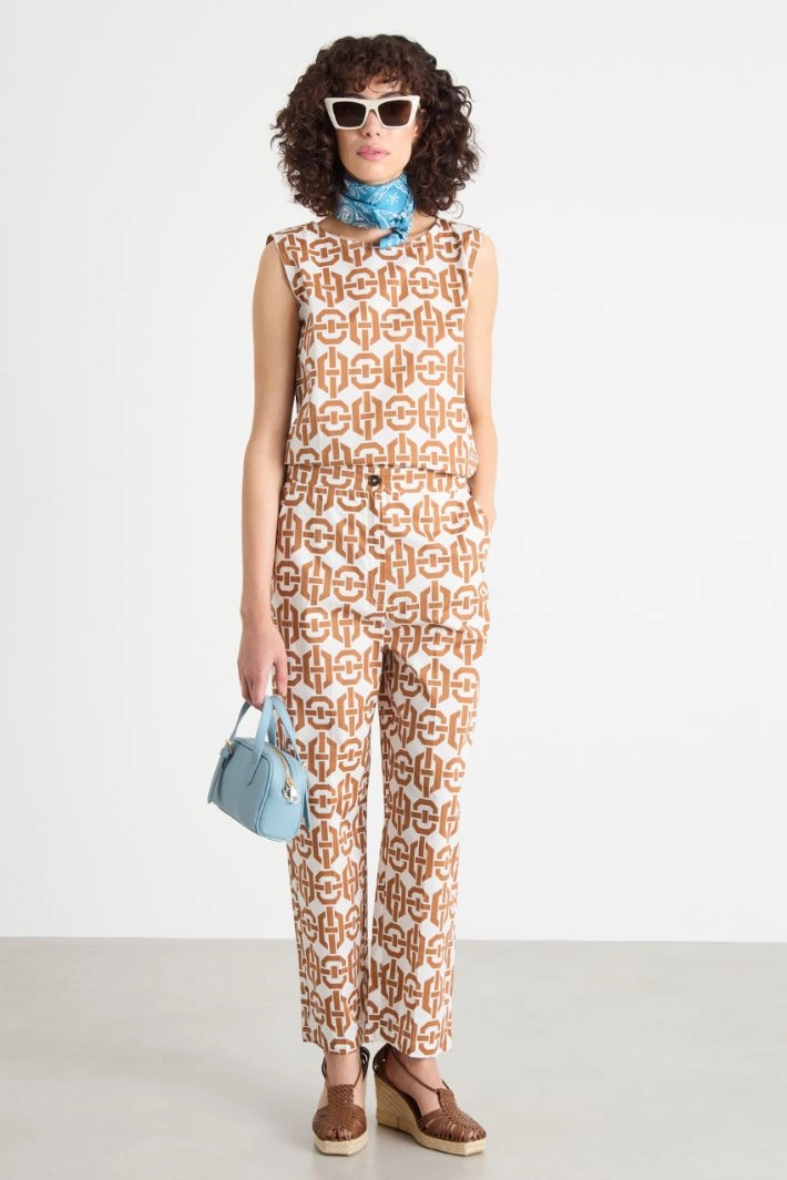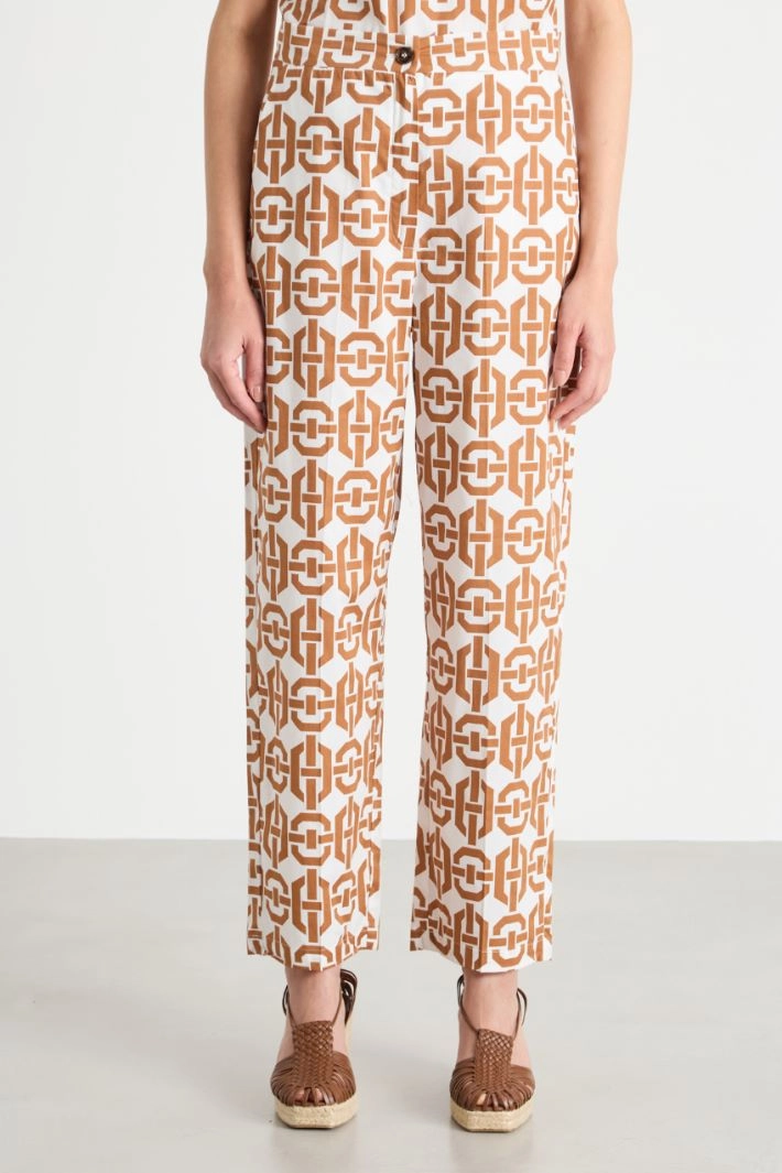 Pantalón de corte recto realizado en popelina de algodón elástico, con bolsillos franceses. Cierre con botón y cremallera oculta.