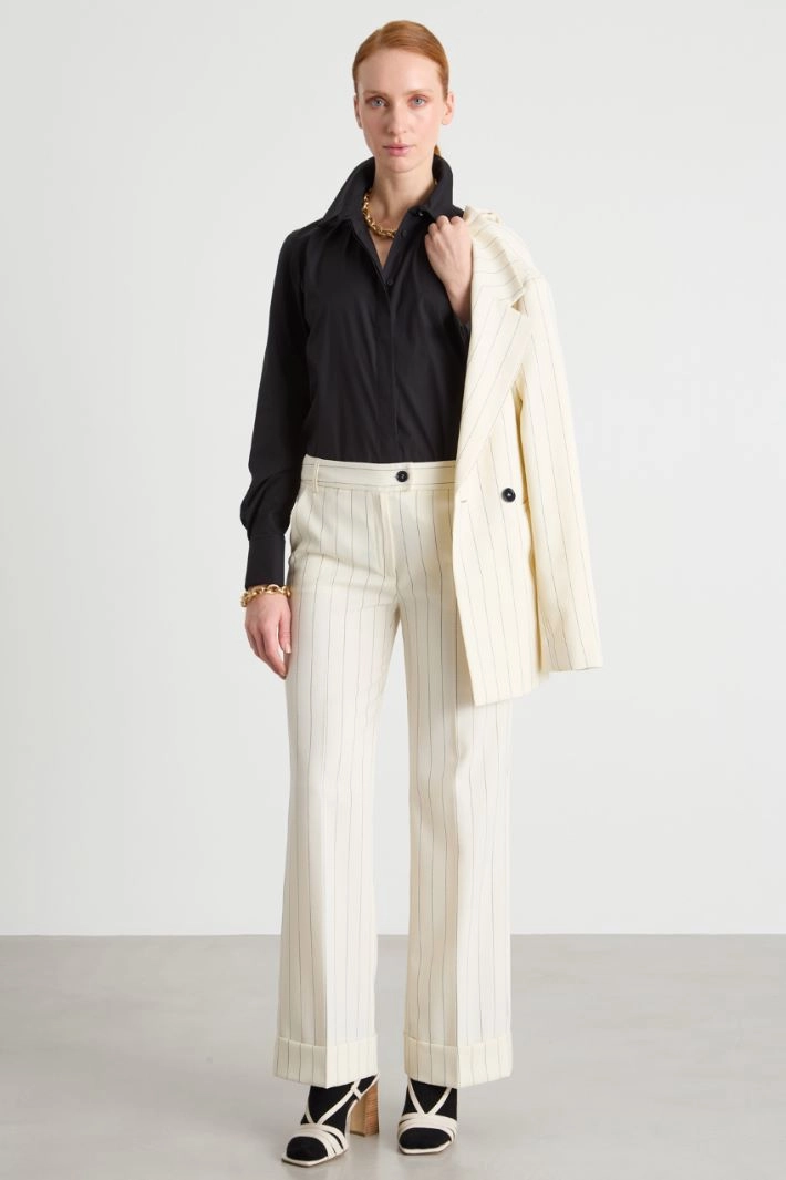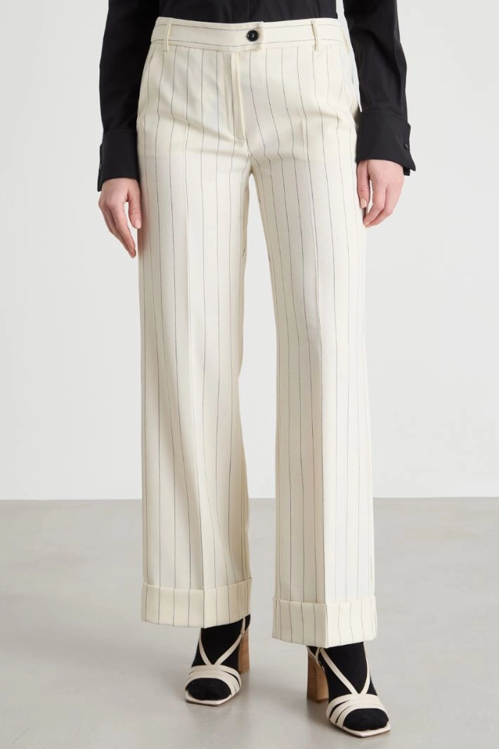 Pantalón de corte recto confeccionado en esterilla de raya diplomática. Presenta trabillas, bolsillos franceses en la parte delantera y bolsillos de vivo en la parte posterior. Bajo con vuelta. Cierre con botón y cremallera oculta.