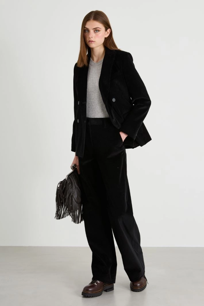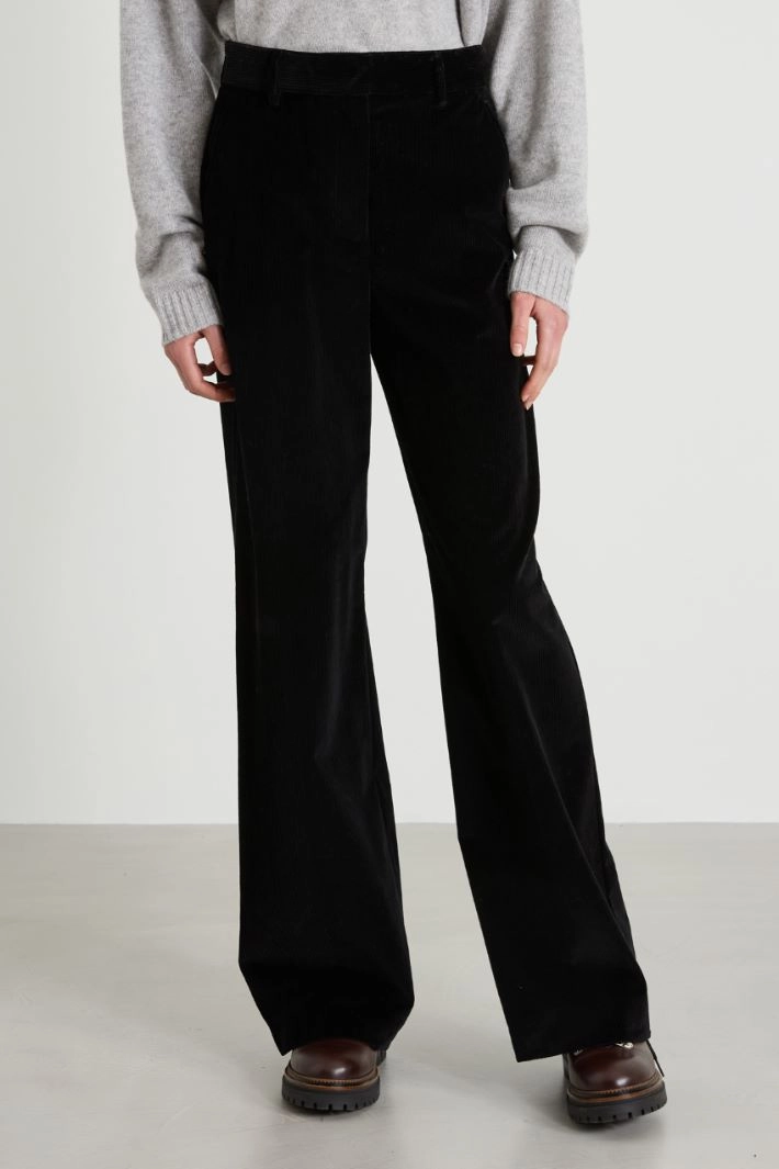 Pantalón recto realizado en pana de puro algodón, con trabillas en la cintura, raya a lo largo, bolsillos franceses delante y bolsillos de ribete detrás. Cierre con cremallera oculta, botón y gancho.