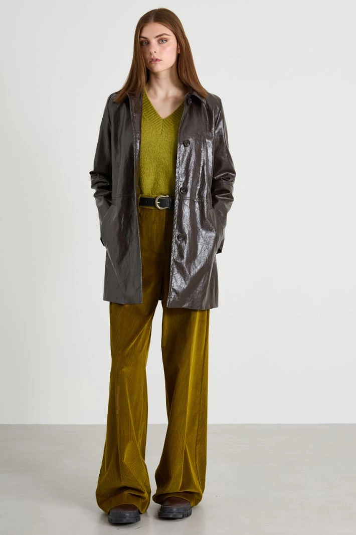 Pantalón recto realizado en pana de puro algodón, con trabillas en la cintura, raya a lo largo, bolsillos franceses delante y bolsillos de ribete detrás. Cierre con cremallera oculta, botón y gancho.