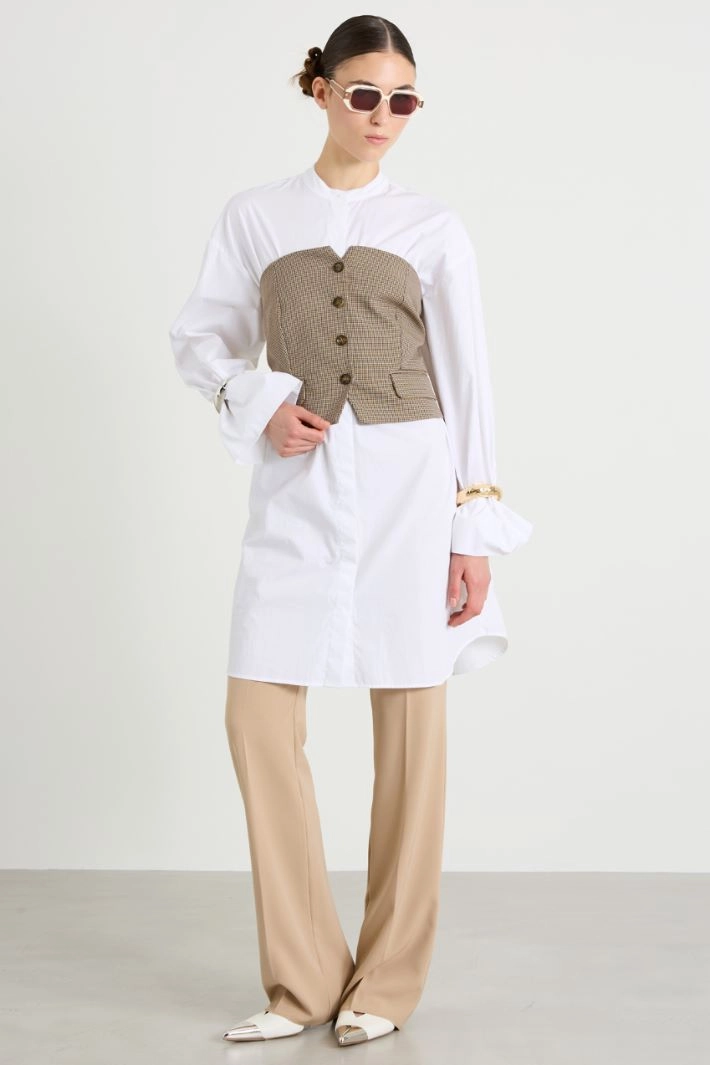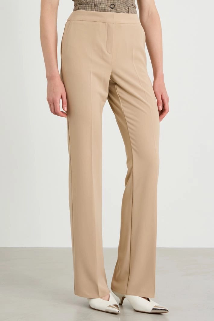 Pantalón ligeramente evasé realizado en sarga elástica, con bolsillos franceses laterales, raya a lo largo y cierre oculto con cremallera, botón y gancho.