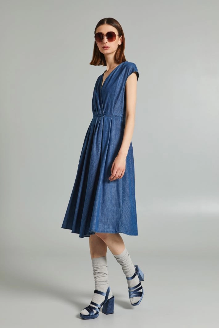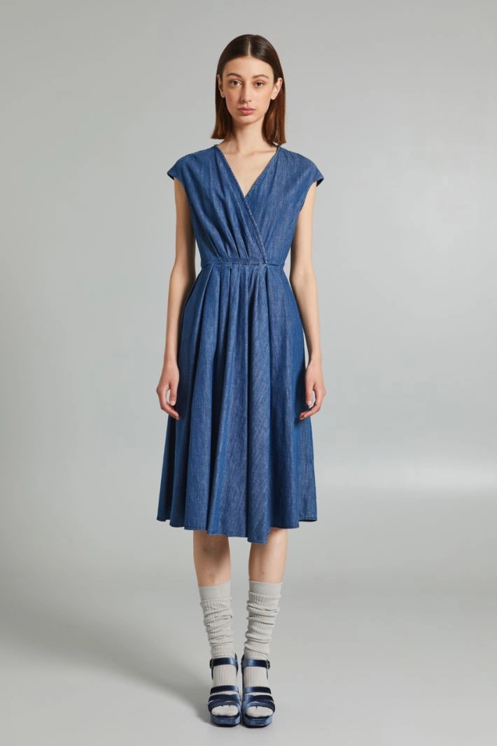 Vestido de corte suave realizado en denim de algodón puro, con escote en V cruzado, mangas mariposa cortas, diseño de pliegues cosidos en la cintura y cierre oculto con cremallera en el lateral.