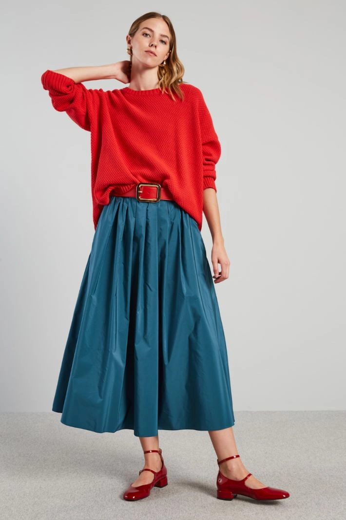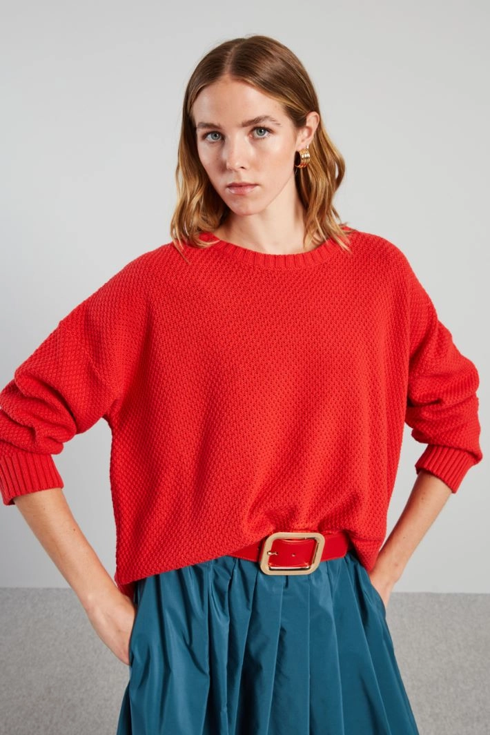 Jersey de corte suave realizado en hilado de cordoncillo de mezcla de algodón, con cuello redondo, mangas largas de sisa caída, aberturas laterales y bordes con acabado de canalé.