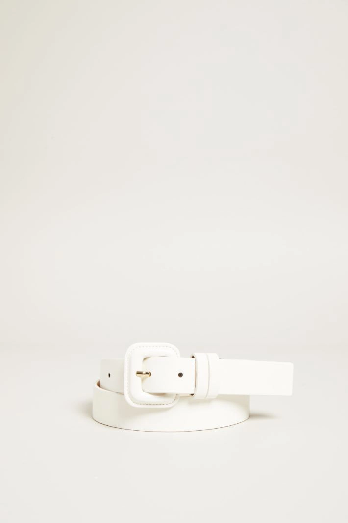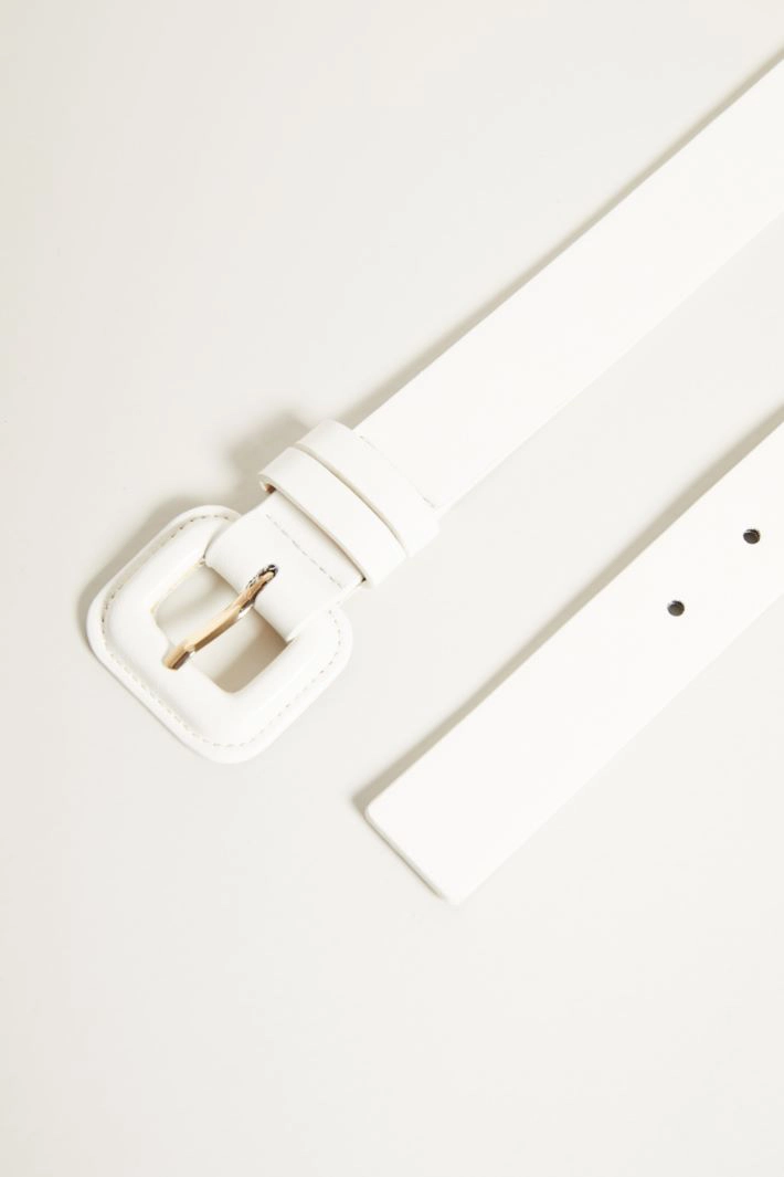 Cinturón realizado en símil piel con acabado brillante con doble trabilla, hebilla forrada y pasador metálico.