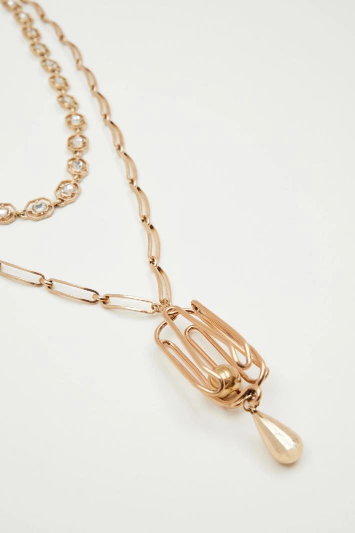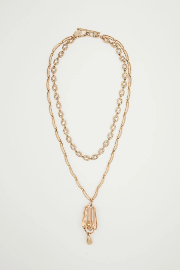 Collar de doble vuelta realizado en metal, compuesto por una cadena larga de eslabones anchos con un colgante de forma abstracta y un collar más corto con detalles de cristal. Cierre en T por detrás.