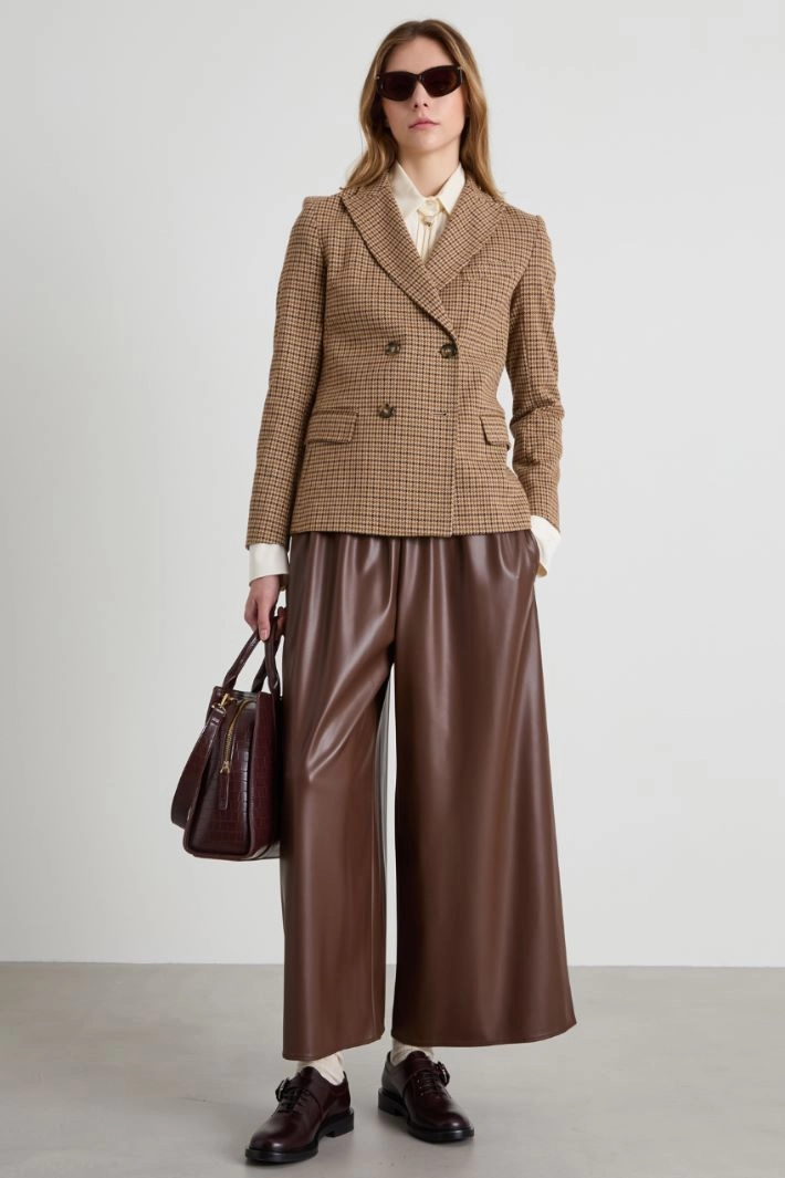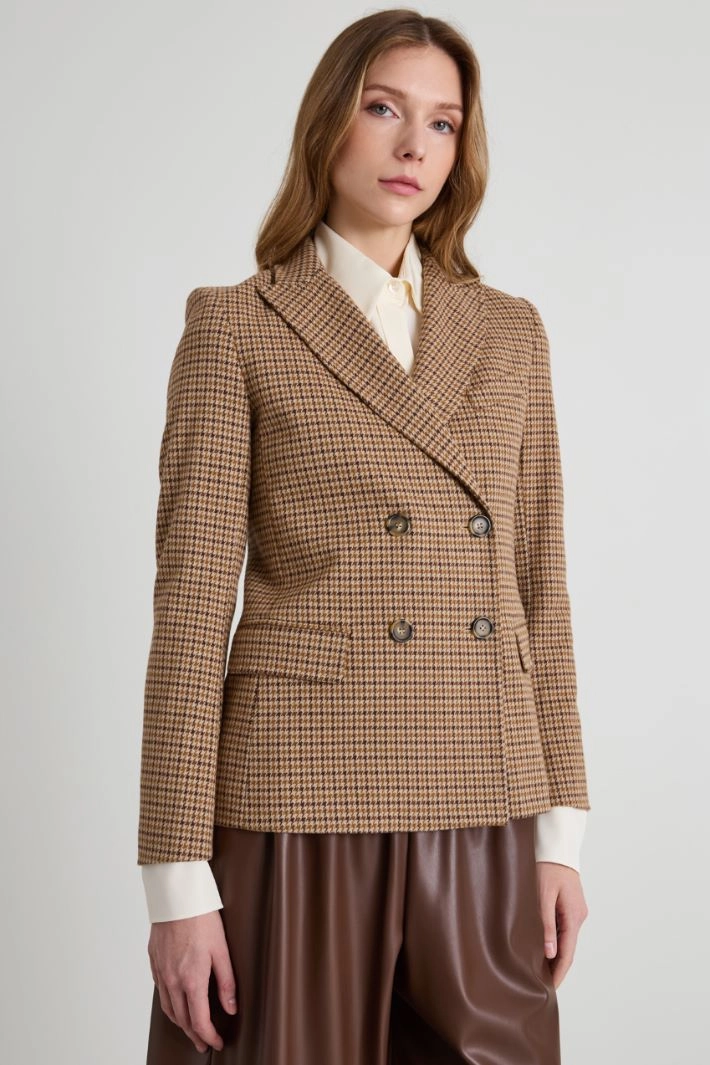 Blazer de corte recto realizado en punto de franela jacquard de mezcla de algodón elástico con estampado pata de gallo, presenta cuello con solapa, mangas largas y bolsillos laterales de doble ribete con solapa. Cierre cruzado con botones. Semi-forrado.