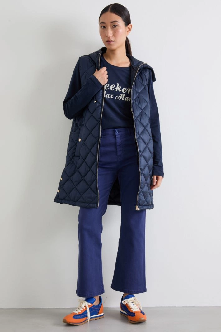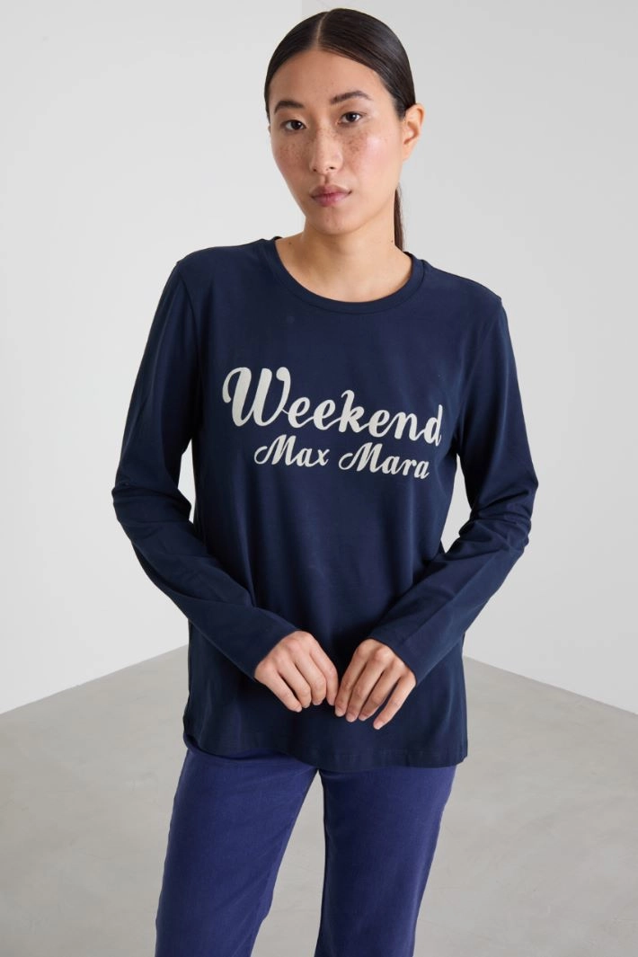 Camiseta de corte recto realizada en punto de algodón elástico teñido en hilo, con motivo estampado flocado en la parte delantera, cuello redondo y manga larga.