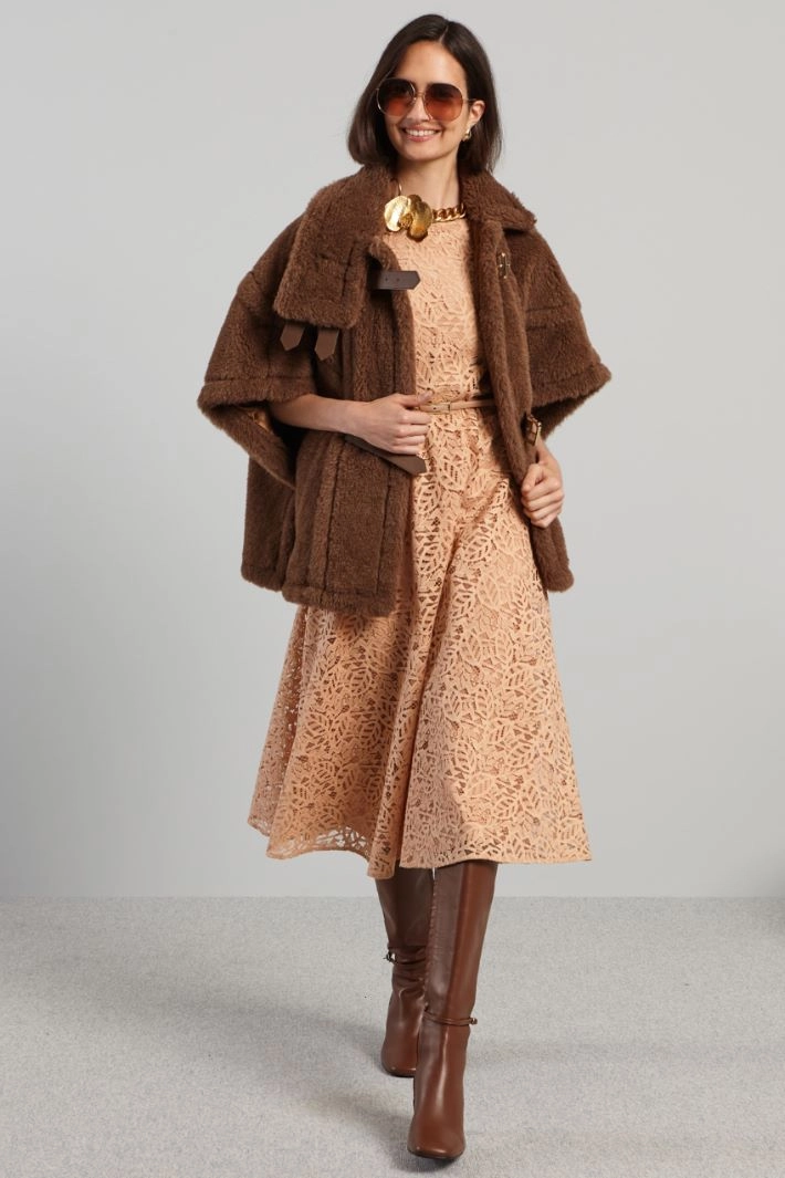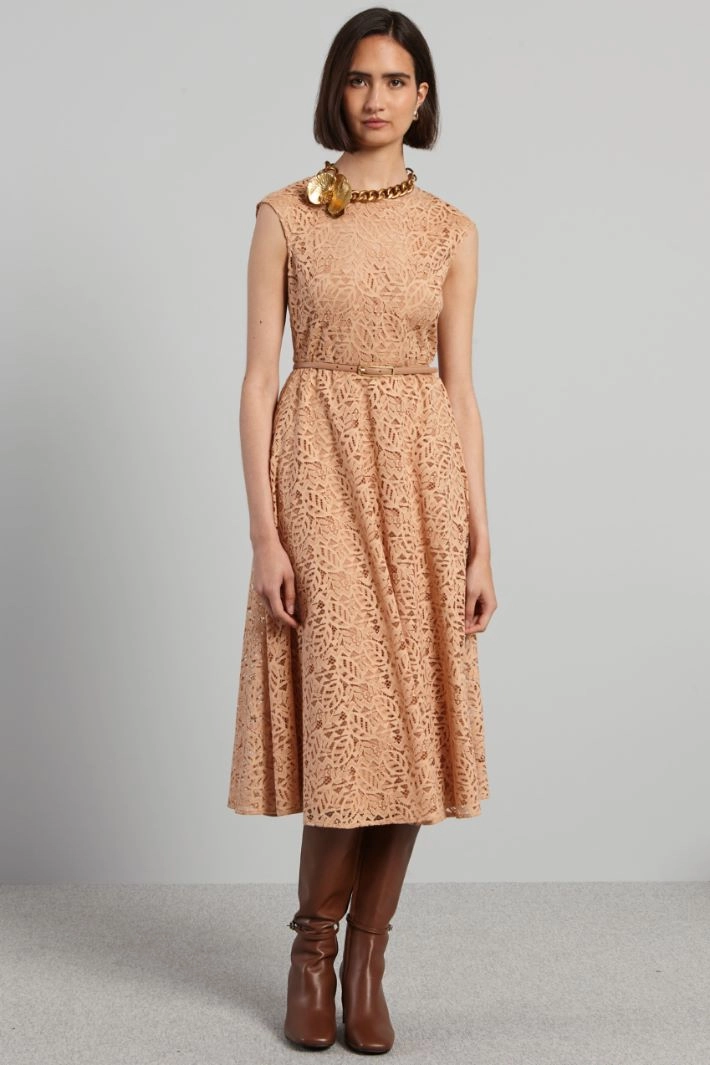 Vestido de corte acampanado realizado en encaje de mezcla de algodón, sin mangas, con cuello redondo y corte en la cintura. Cierre con cremallera invisible en la parte trasera. Incluye cinturón fino de polipiel y combinación a juego.